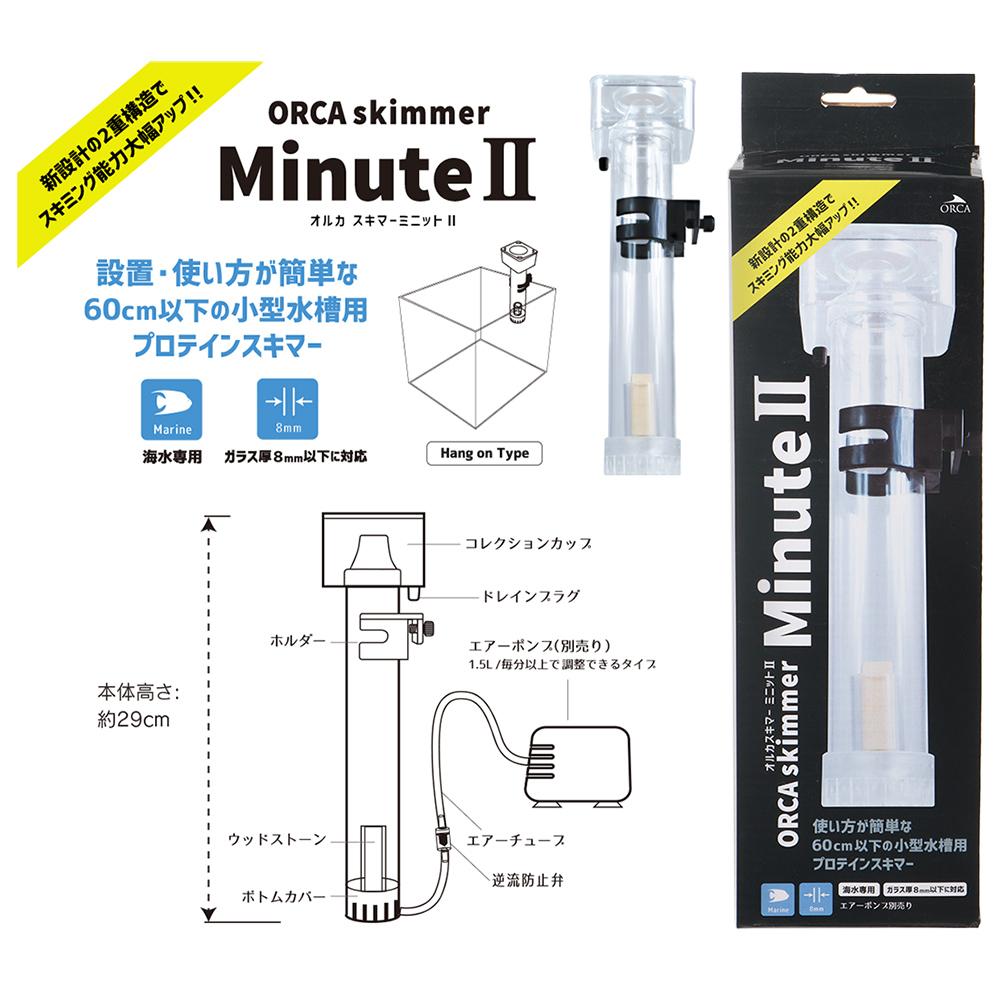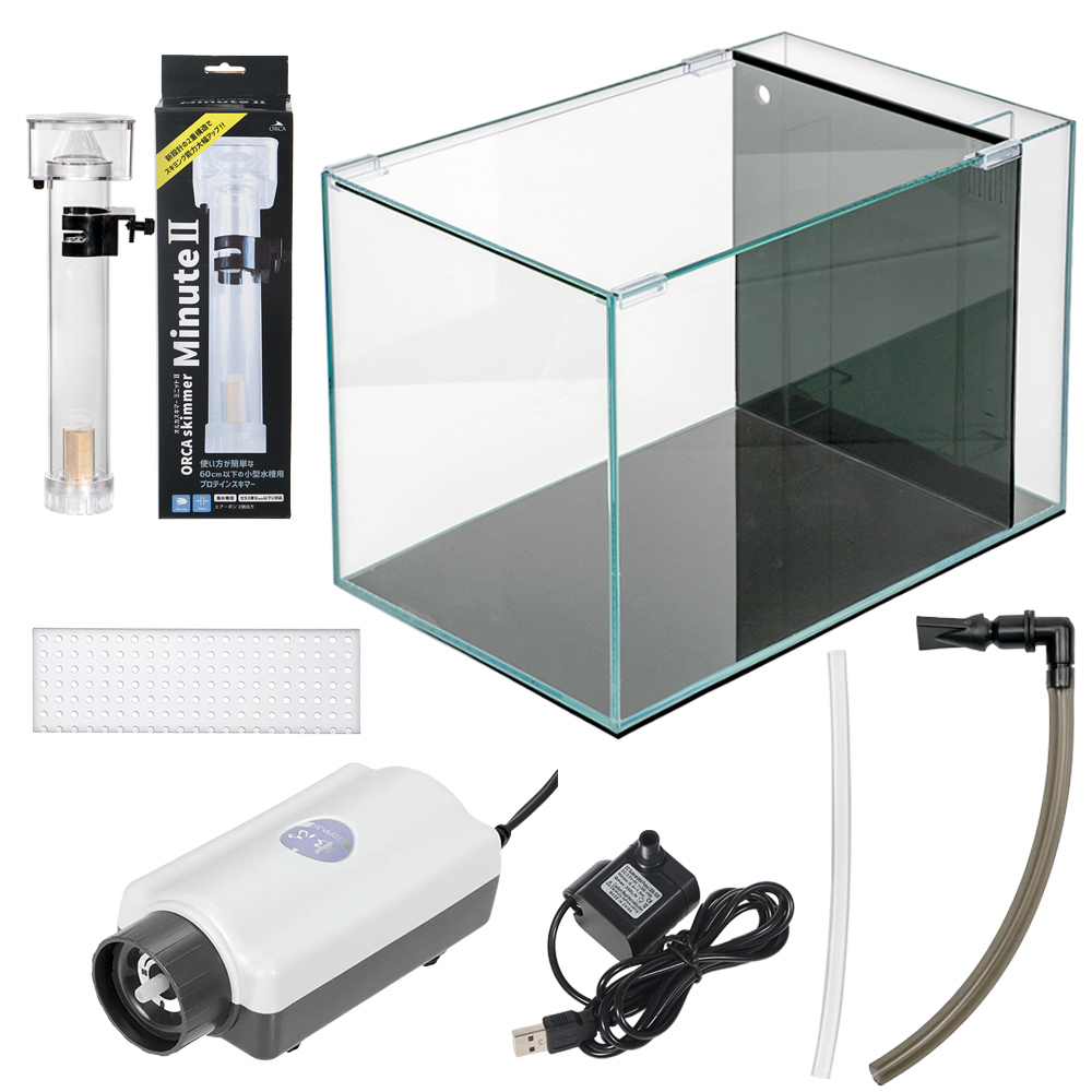 | 特徴 | 水中ポンプ付属の背面フロー水槽に、エアリフト式プロテインスキマーを組み合わせたセットです。 【ガラス水槽 アクロ 45cm背面フロー水槽 スーパークリア】 サイズ:45×27×30cm ・背面ろ過槽を採用した「アクロ」シリーズの水槽。 ・高い透明度の高透過ガラスを採用。 ・背面ろ過槽にポンプ、小型プロテインスキマーなどを収容可能。 ・コンパクトにアクアリウムを楽しみたい方におすすめ。 【エアポンプ:水心 SSPP―3S(エア量ダイヤル調整式)】 ・静かといわれるエアポンプの代表ともいえる「水心」シリーズ。 ・従来型の1/3(当社比)まで静音を実現しました。 ・ダイヤルでエアー吐出量が調節可能です。 ・全機種とも吊り下げての使用が可能となっています。 ・オゾン対応ダイヤフラムを使用しています。 ・交換パーツはユニット交換式で、簡単に交換可能 。 【オルカスキマー ミニット2】 ・小型水槽用、エアリフト式プロテインスキマーです。 ・新設計の2重構造で、スキミング能力が大幅にアップしました。 ・エアーポンプを接続するだけで簡単に使用できます。 ・ウッドストーンによる微細な泡で水中の有機物を取り除きます。 ・酸欠を防止しバクテリアの活性を高める役割もあります。 ・コンパクトにアクアリウムを楽しみたい方におすすめです。 |