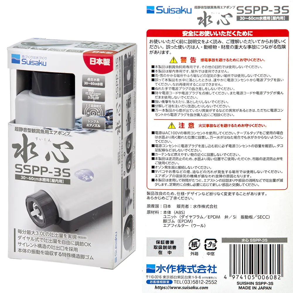 | 仕様 | 【背面フロー用ポンプ】 定格電圧:DC3.5-9V 定格消費電力:1-3W Hmax(最高水圧):0.4-1.5mm QMAX(最大流量):200L/H 電源:USB 【水作 エアーポンプ 水心 SSPP-3S】 電源アダプタ定格:AC100V 電源周波数:50/60Hz 共用定格消費電力:50Hz 2.5W/60Hz 2.1W 最大吐出量:開放時 3.0L/m (※水深25cm:最大1.7L/m) 圧力:50Hz 14kPa/60Hz 20kPa 騒音:50Hz 38dB/60Hz 35dB 月電気量目安:50Hz 49円/60Hz 41円 重量(約):293g |
