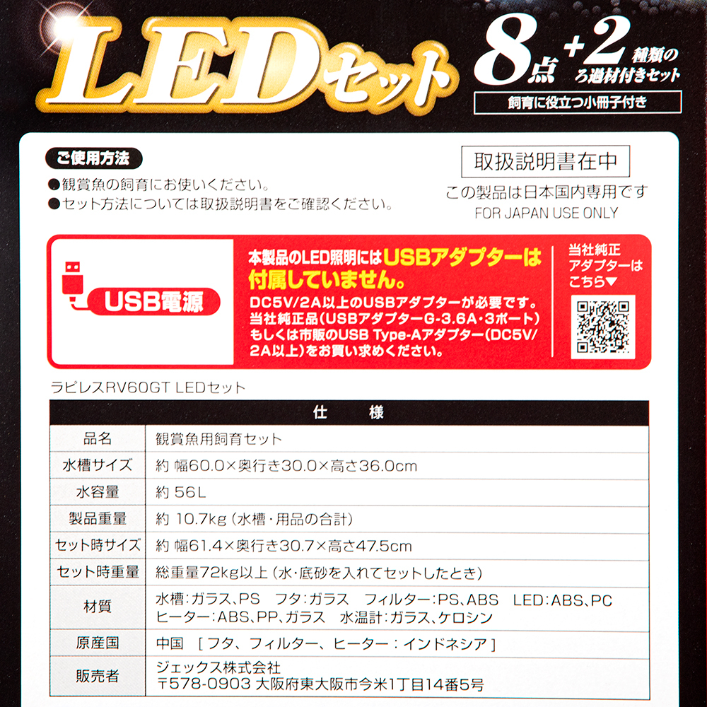 | セット内容 | ・60cm曲げガラス水槽 ラピレス RV60×1 ・GEX グランデ600 GR-600×1 ・GEX クリアLED フラッティ 600BK×1 ・ヒーター(ロットによって種類が異なります。)×1 ・水温計×1 ・ガラスフタ×1 ・カルキ抜き×1 ・水質調整剤×1 ・お試しフード×1 |