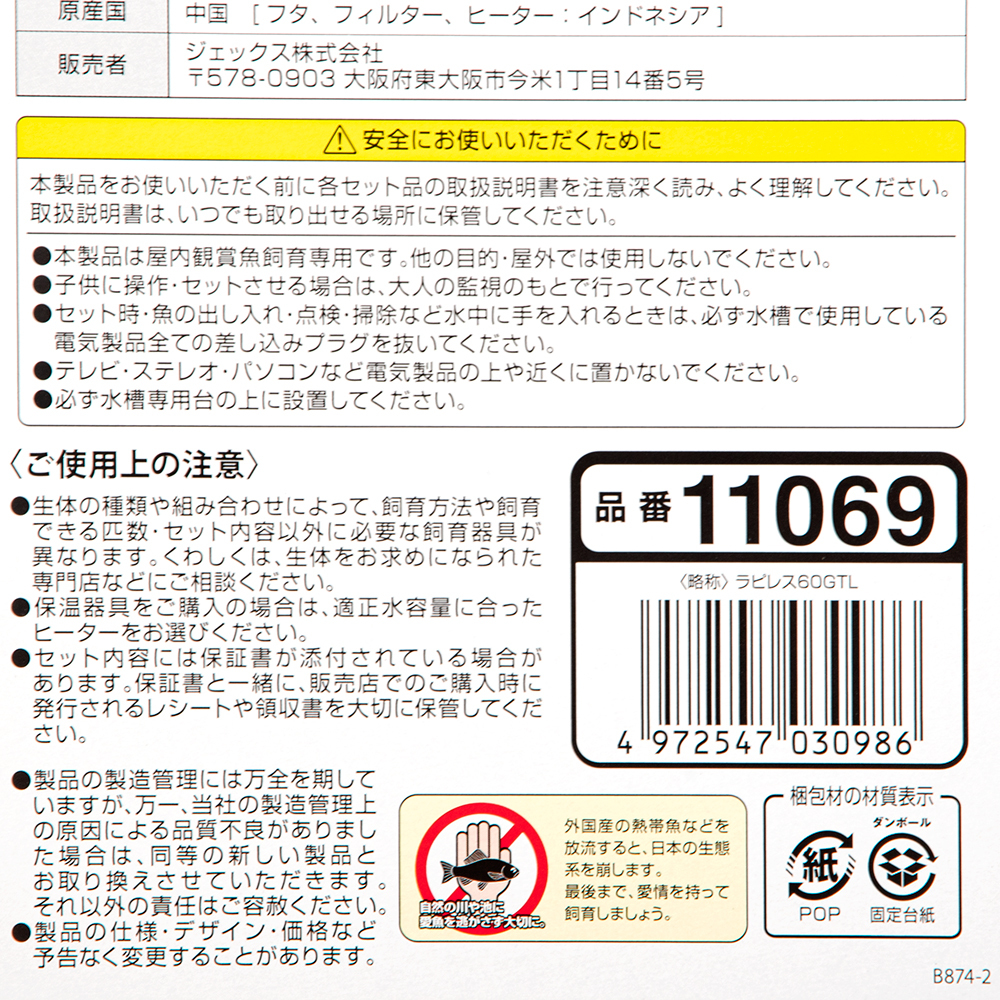 | 材質 | 水槽:ガラス、PS フタ:ガラス フィルター:PS、ABS LED:ABS、PC ヒーター:ABS、PP、ガラス 水温計:ガラス、ケロシン |