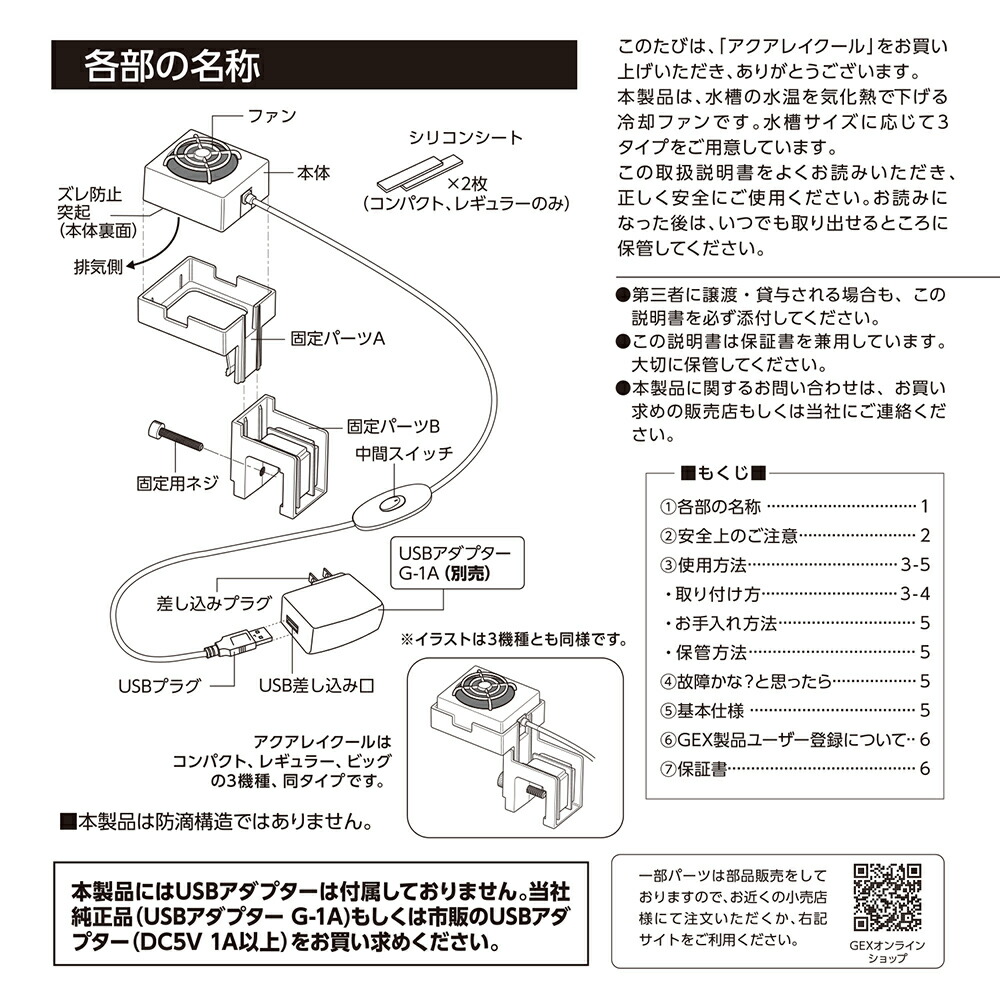 | 仕様 | 定格電圧/周波数:AC100V 50Hz/60Hz 定格消費電力:DC5V 1.0W、AC100V 1.4W 使用アダプター:USBアダプター G-1A 入力:AC100V、出力:DC5V 1A 電源コード:約1.5m(中間スイッチ含む) 重量:約165g 【固定パーツで取り付けられるフレームレス水槽のガラス厚(約)】 ・パーツAで固定:4~5mm ・パーツA+Bで固定:2~12mm |