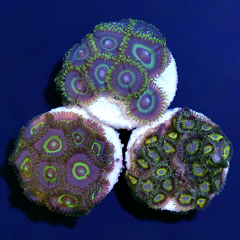| 種類詳細 | イソギンチャクに近い種類のソフトコーラルで4~8mmのポリプが浅い海の岩の上にマット状の共肉でつながった大きな群体をつくります。 カラーバリエーションが豊富でグリーン、オレンジ、ピンク、レッドなどがありポリプの中心部に色が付いているものもあります。 今回は数あるカラーの中からグリーン系の個体を選別しました! 丈夫ですのでサンゴ入門におすすめの種類で光・水流・水質ともに最低限の設備で飼育可能ですが環境を整えてあげると色はよく揚がり増殖するスピードも早くなります。 給餌は基本的に不要ですが与える場合は液体もしくは粉末状のものを週に1度程度吹きかけてあげると良いでしょう。 |