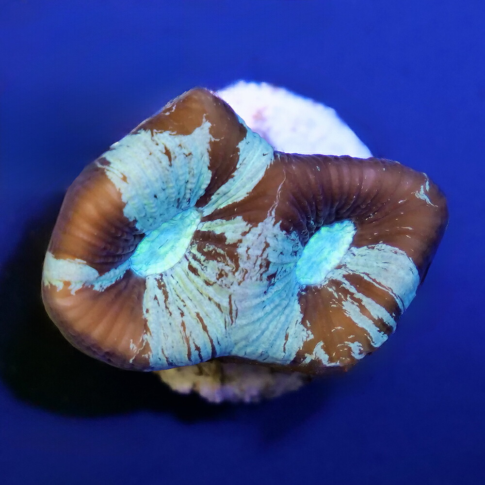 | 種類詳細 | グリーンやレッドなどの多彩な色彩をもつキクメイシの仲間ではかなりシックな色合いの個体で、まるでモノクロ映画の登場人物のような落ち着いた色合いなので、引き立て役のサンゴとしておすすめです。 本種は、セル状の骨格をなぞって切断しても、数週間程度でマウスを増殖させ骨格形成を行い増大してゆきます。 共肉を痩せさせないために、水槽内の状態・水質を見ての液体給餌が有効です。 また、夜間にポリプが開いている状態では、冷凍コペポーダなどのエサを触手に引っかかるようにスポイトなどを用いて確実に給餌させるとよいでしょう。 藻類が付着するとポリプが侵食され死んでしまうので、水質は藻類が発生しにくいよう清浄に保つことが重要です。 |