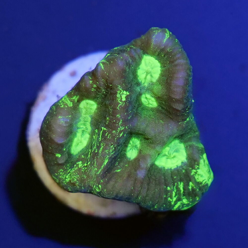 | 種類詳細 | 深緑色の共肉をベースに内輪のマウスや外輪にマーブル状の蛍光グリーンをあしらったキクメイシの仲間です。 マウス付近には蛍光色の強く、存在感もあり、ほぼグリーン系のサンゴといえるでしょう。 本種は、セル状の骨格をなぞって切断しても、数週間程度でマウスを増殖させ骨格形成を行い増大してゆきます。 共肉を痩せさせないために、水槽内の状態・水質を見ての液体給餌が有効です。 また、夜間にポリプが開いている状態では、冷凍コペポーダなどのエサを触手に引っかかるようにスポイトなどを用いて確実に給餌させるとよいでしょう。 藻類が付着するとポリプが侵食され死んでしまうので、水質は藻類が発生しにくいよう清浄に保つことが重要です。 |