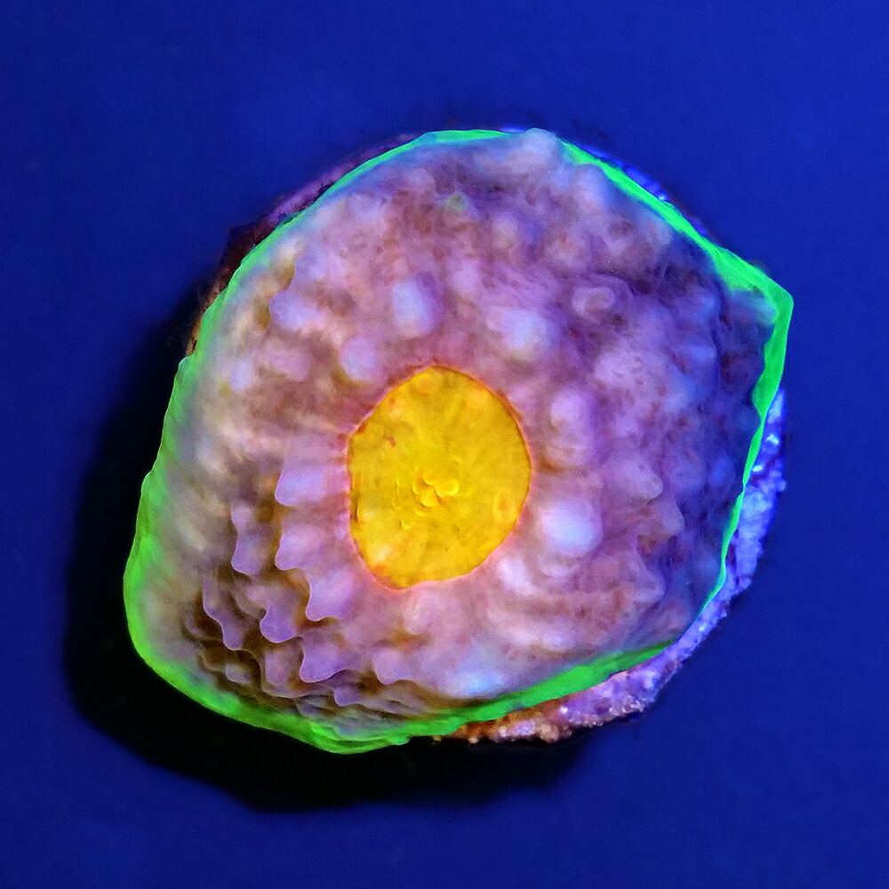 | 種類詳細 | 非常に丈夫で飼育しやすい為、ハードコーラル入門にピッタリなサンゴです。 色はブラウン、グリーン、レッド、ブルーなどの単色の物やブルーにレッドのドットなど様々なカラーがあります。 オレンジやグリーンの個体は蛍光色に輝くものも存在し、水槽内を幻想的に彩ります。 キッカサンゴの仲間は毒性が強いので他のサンゴに触れないようにご注意下さい。 給餌は基本的に液体飼料を与えます。クリル片等を週に1度程度与えるのも良いでしょう。 |