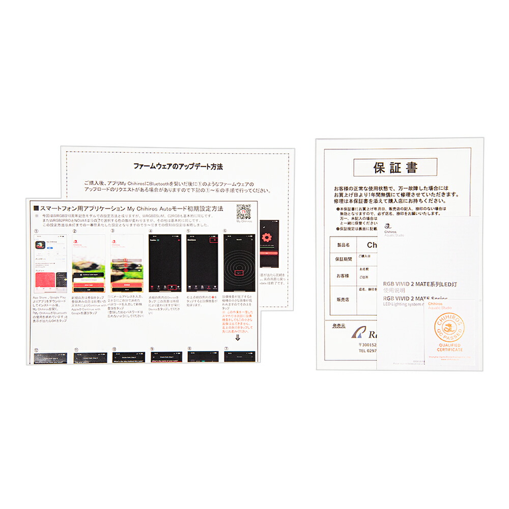 | ご使用方法 | ●スマートフォン用無料アプリケーション My Chihirosの使用に関して ※操作を行っても機器を読み込まない場合は、下記の操作を行ってください。 1.アプリを閉じて、もう一度開いて操作する。 2.アプリMy Chihirosをスワイプで完全に終了してからもう一度開きなおす。 3.iPhonの場合 設定→Bluetooth→ONにする。 さらに設定→My Chihiros→Bluetooth→ONにする。 4.Androidの場合 設定→接続→Bluetooth→ONにする。 5.LEDの電源プラグを抜いて差し込みなおしてから操作を繰り返す。 ※アプリでの表示では色温度などの仕様は従来品と異なります。 |
