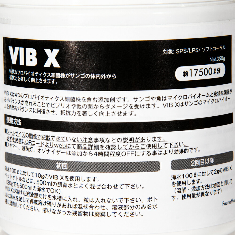 | ご使用方法 | ●初期使用時 海水100リットルに対して10gのVIB Xを使用します。 ペットボトル等の容器に10gのVIB Xと飼育水500mlを入れ、よく混ぜ合わせてください。 沈殿物は入れずに溶かした溶液のみを水流のある場所に入れ、もう一度容器に飼育水を入れよく混ぜ合わせてください。 同様の手順を複数回繰り返し溶け残った残留物は水槽へは入れず、捨ててください。 ●通常使用 海水100リットルに対して2gのVIB Xを使用します。 添加する手順は初回と同じ方法となります。 |