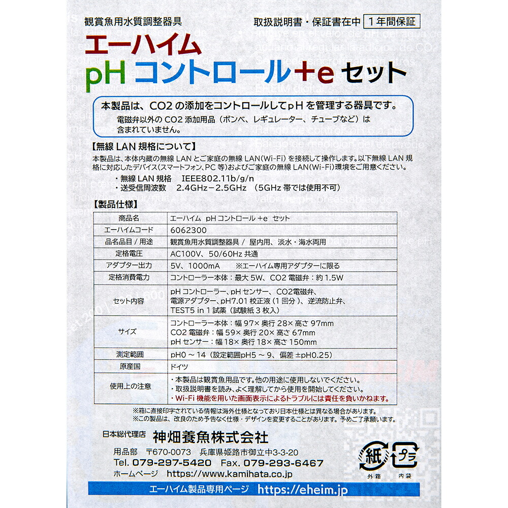 | セット内容 | pHコントローラー、pHセンサー、CO2電磁弁、電源アダプター、pH7.01校正液(1回)、逆流防止弁、TEST5 in 1 試薬(試験紙3枚入) |