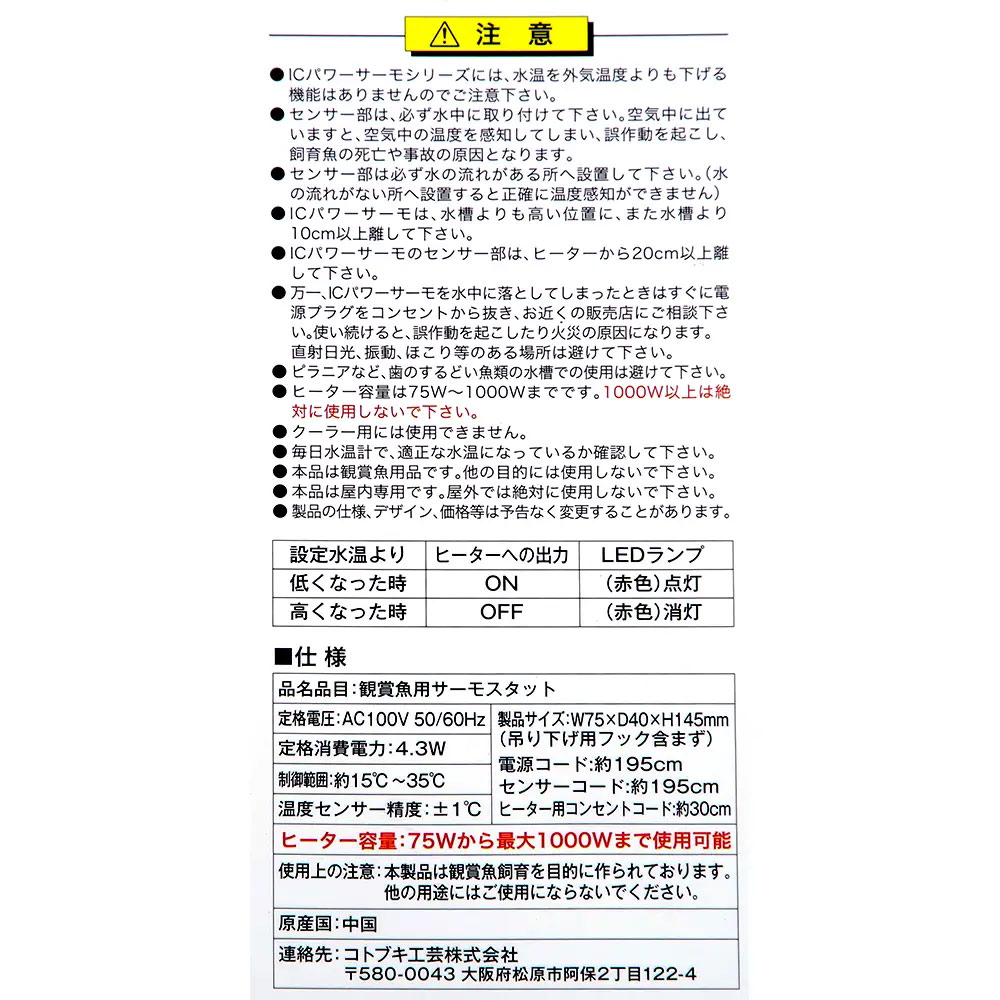 | ご注意 | ※本品はアクアリウム用品です。目的以外の用途では使用しないでください。 【パワーサーモ】 ※ヒーター容量は75-1000Wです。1000W以上は絶対に使用しないでください。 |