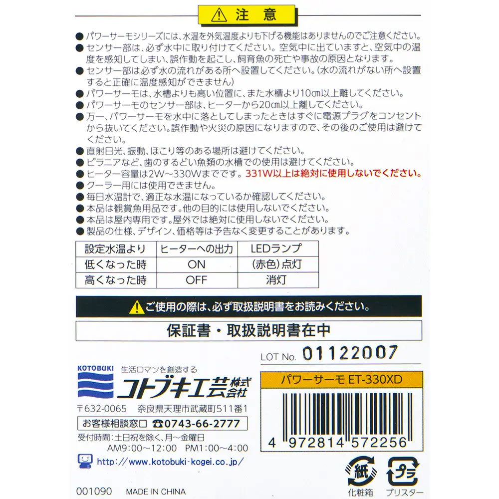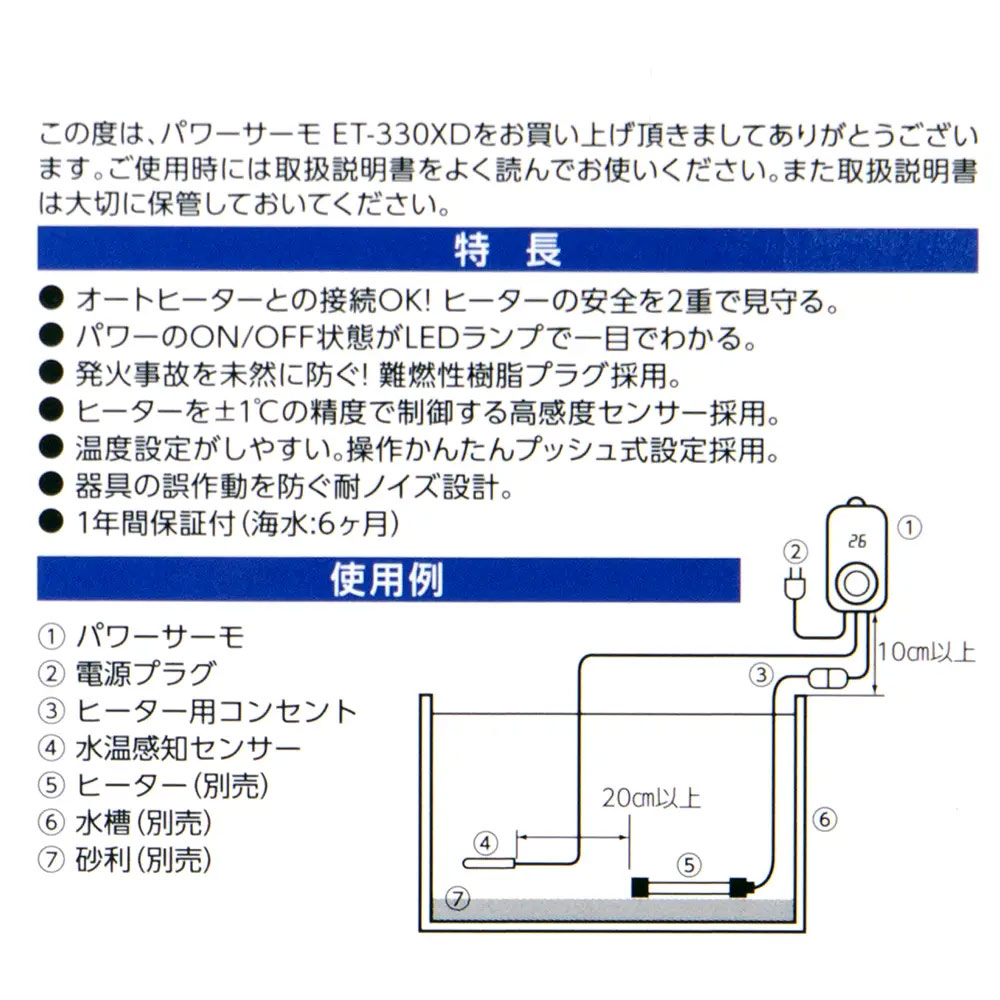 | ご注意 | ※本品はアクアリウム用品です。目的以外の用途では使用しないでください。 ) 【パワーサーモ】) ※ヒーター容量は2-330Wです。331W以上は絶対に使用しないでください。 |
