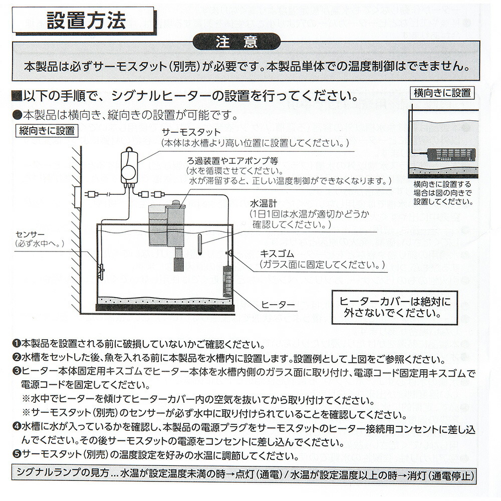 | ご使用方法 | ●取扱説明書を参考にセットしてください。 ●水温の管理には、必ず水温計を併用してチェックしてください。 ●ヒーターカバーは必ず装着した状態で使用してください。 ●エアレーション又はろ過装置を使用し、水槽内の水が攪拌されている状態の水槽で使用してください。 |