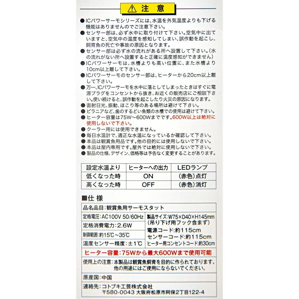 | ご注意 | ※本品はアクアリウム用品です。目的以外の用途では使用しないでください。 ※ヒーター容量は75-600Wです。600W以上は絶対に使用しないでください。 |