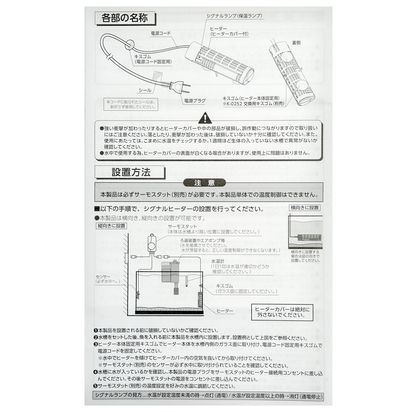 | ご注意 | ※本製品は観賞魚専用用品です。他の目的には使用しないでください。 ※本品に温度を下げる機能はありません。周囲温度が設定温度以上になると水温も上昇する場合があります。 ※本品は消耗品です。必ず1年を目安に交換してください。 ※ヒーターカバーは必ず装着し水中でご使用ください。 |