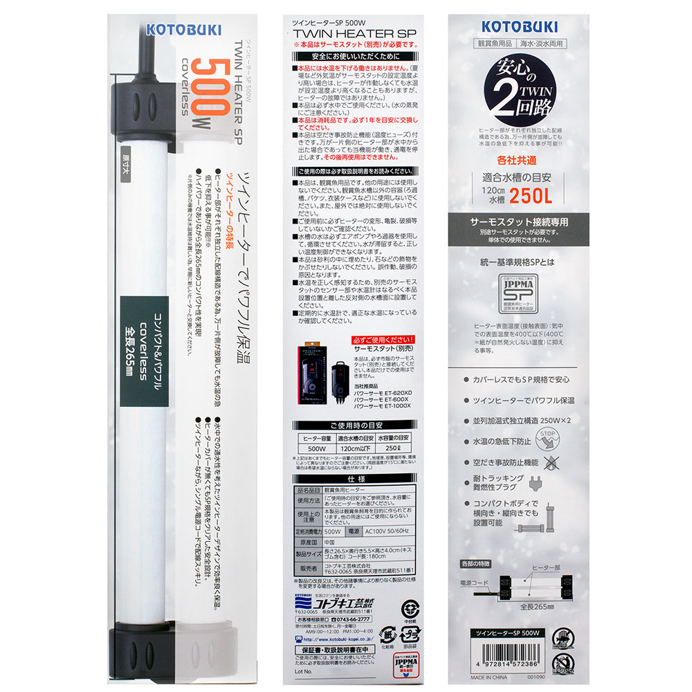 | 特長 | ●水温の急低下を防止する安心の2回路でヒーター部がそれぞれ独立した配線構造である為、万一片側が故障しても、水温の急低下を抑える事が可能です。 ●ハイパワーでありながら全長265mmのコンパクト性を実現しました。 ●水中での通水性を考えたツインヒーターデザインで効率良く保温できます。 ●ヒーターカバーが無くてもSP規格をクリアした安全設計です。 ●ツインヒーターながら、シングル電源コードで配線スッキリ。 ●カバーレスでもSP規格で安心。 ●コンパクトボディで横向き・縦向きでも設置可能です。 ●サーモスタット接続専用です。 |