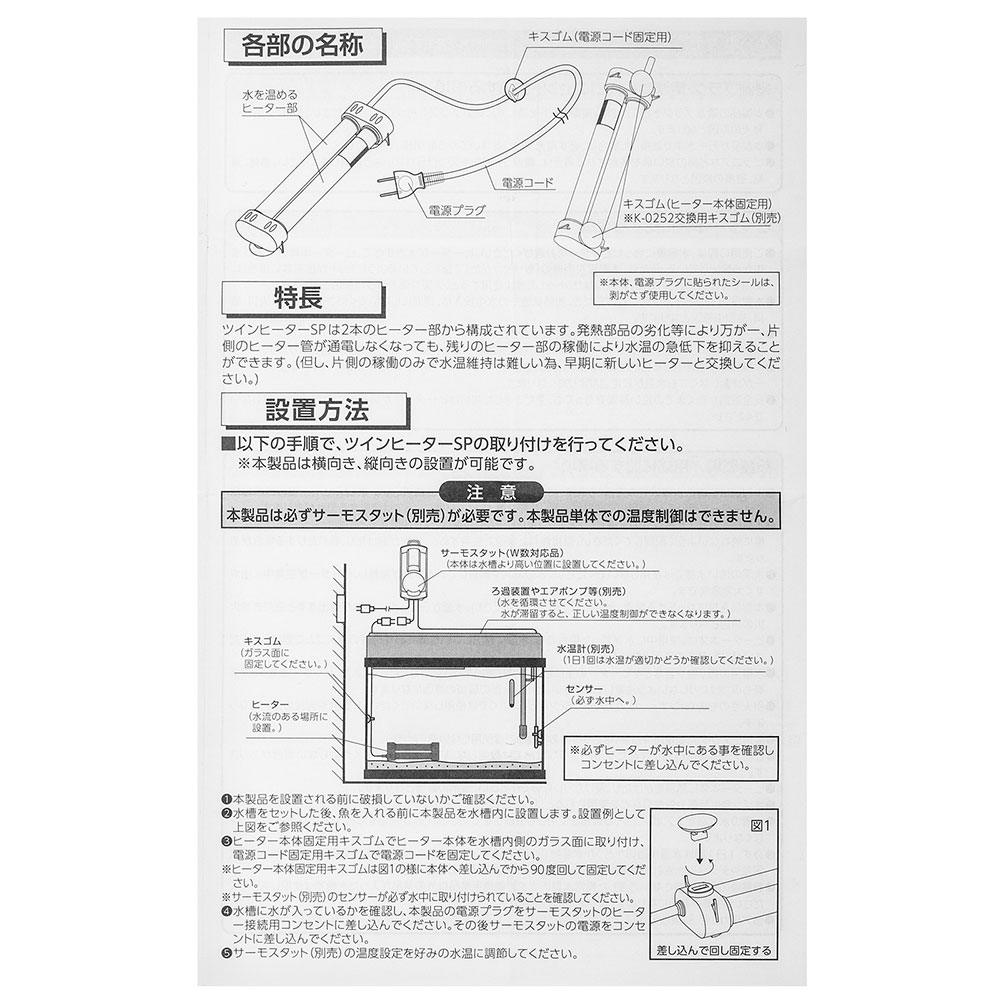 | ご注意 | ※本製品は観賞魚専用用品です。他の目的には使用しないでください。 ※本品はサーモスタット接続専用です。単品での使用はできません。 ※本製品には水温を下げる能力はありません。 ※本品は消耗品です。必ず1年を目安に交換してください。 ※子供には操作、セットさせないでください。操作させるときは大人の監視の元で行ってください。 ※セット時、魚の出し入れ、点検、掃除など水中に手を入れる時は、必ず水槽で使用している電気製品全ての差し込みプラグを抜いてください。 ※本製品は直射日光のあたる所や湿気・ほこりの多い所、油煙のあたる所では使用しないでください。 |