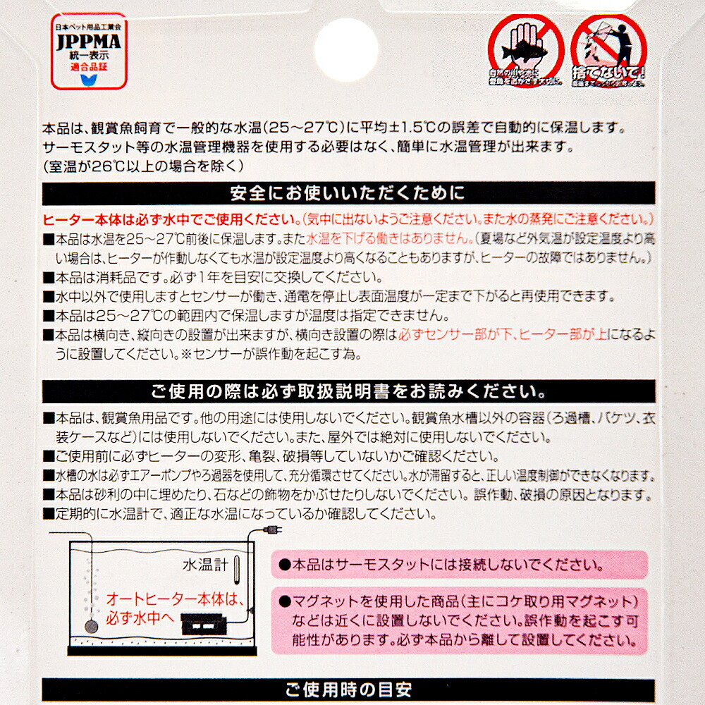 | ご注意 | ※本品には水温を下げる働きはありません。(夏場など外気温が設定温度より高い場合は、ヒーターが作動しなくても水温が設定温度より高くなることもありますが、ヒーターの故障ではありません。) ※本品は必ず水中でご使用ください。(水の蒸発にはご注意ください。) ※本品は消耗品です。必ず1年を目安に交換してください。 ※本品は観賞魚用品です。他の用途には使用しないでください。 ※水槽の水は必ずエアーポンプやろ過器を使用して循環させてください。 ※本品は砂利の中に埋めたり、石などの飾物をかぶせたりしないでください。 ※本品はサーモスタットに接続しないでください。 ※マグネット(主にコケ取り用マグネット)を使用した商品を本品の近くに設置しないでください。誤作動の原因になります。 ※横向き設置の際は必ずセンサー部分が下、ヒーター部分が上になるように設置してください。 |