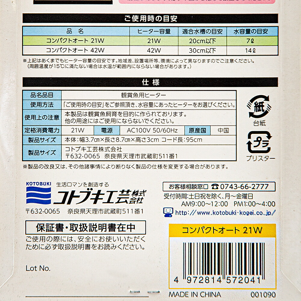 コトブキ工芸 コンパクトオート 21W 25~27℃固定式 ~7L水槽用 オートヒーター アクアリウム 熱帯魚