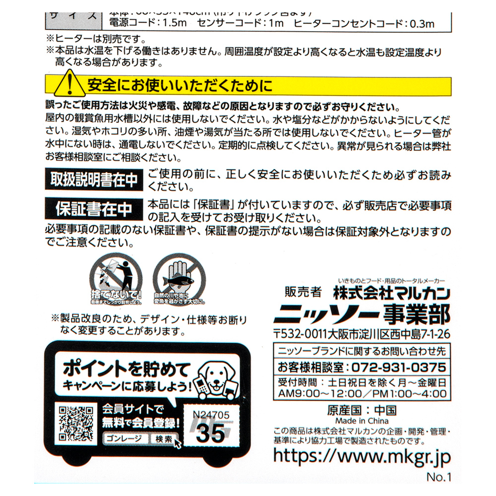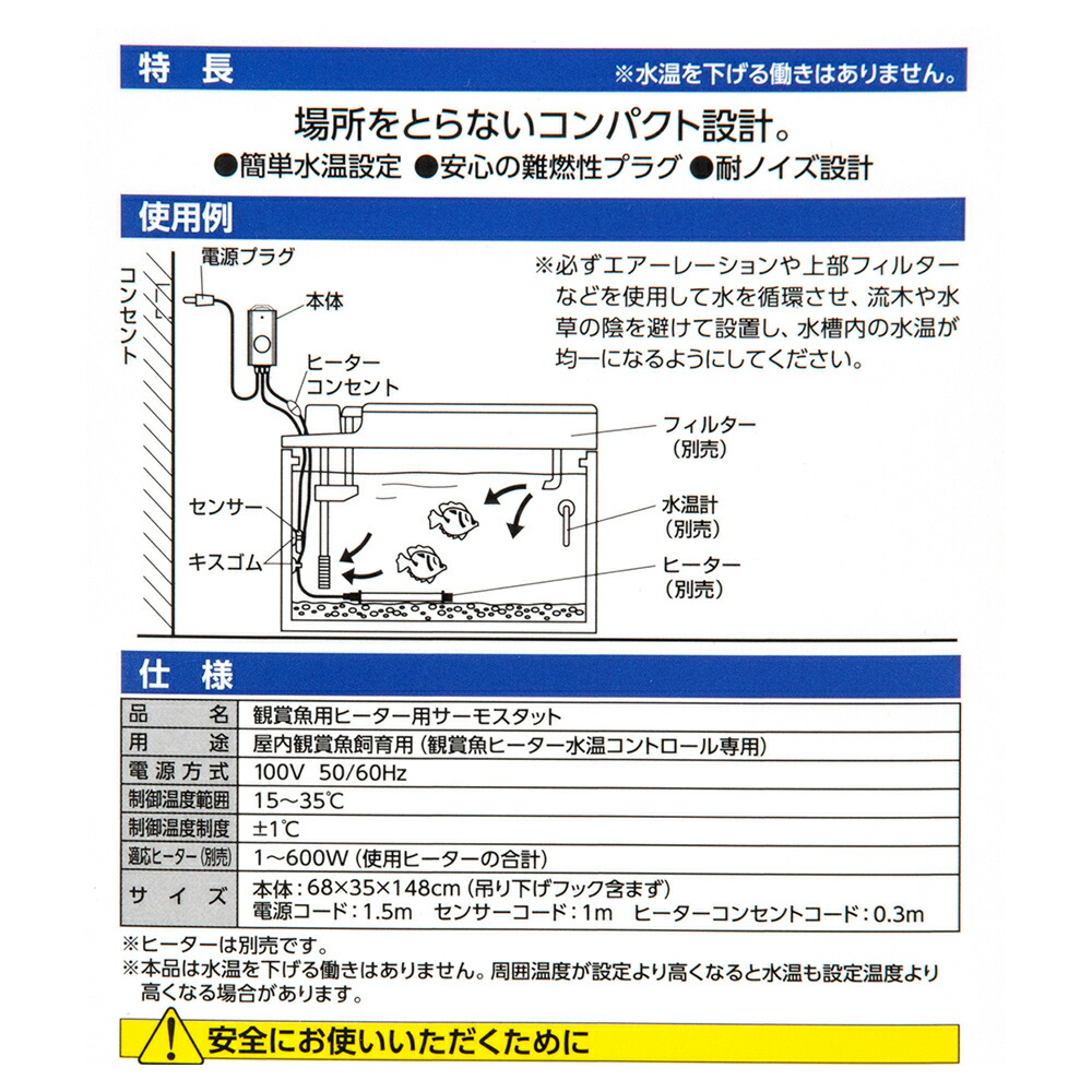 | ご注意 | ※本品は観賞魚水槽用ヒーターとサーモスタットのセットです。それ以外の目的では使用しないでください。 ※セットのヒーターは縦置きでの設置はできません。 |