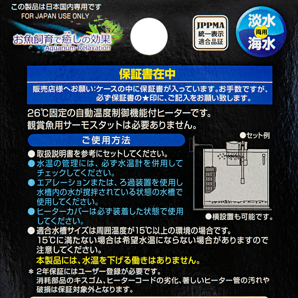 | ご使用方法 | ●取扱説明書を参考にセットしてください。 ●26℃固定の自動温度制御機能付きヒーターです。観賞魚用のサーモスタットは必要ありません。 ●水温の管理には、必ず水温計を併用してチェックしてください。 ●エアレーション又はろ過装置を使用し、水槽内の水が攪拌されている状態の水槽で使用してください。 ●ヒーターカバーは必ず装着した状態で使用してください。 ●適合水槽サイズは周囲温度が15℃以上の環境の場合です。15℃に満たない場合は希望水温にならない場合がありますので注意してください。 |