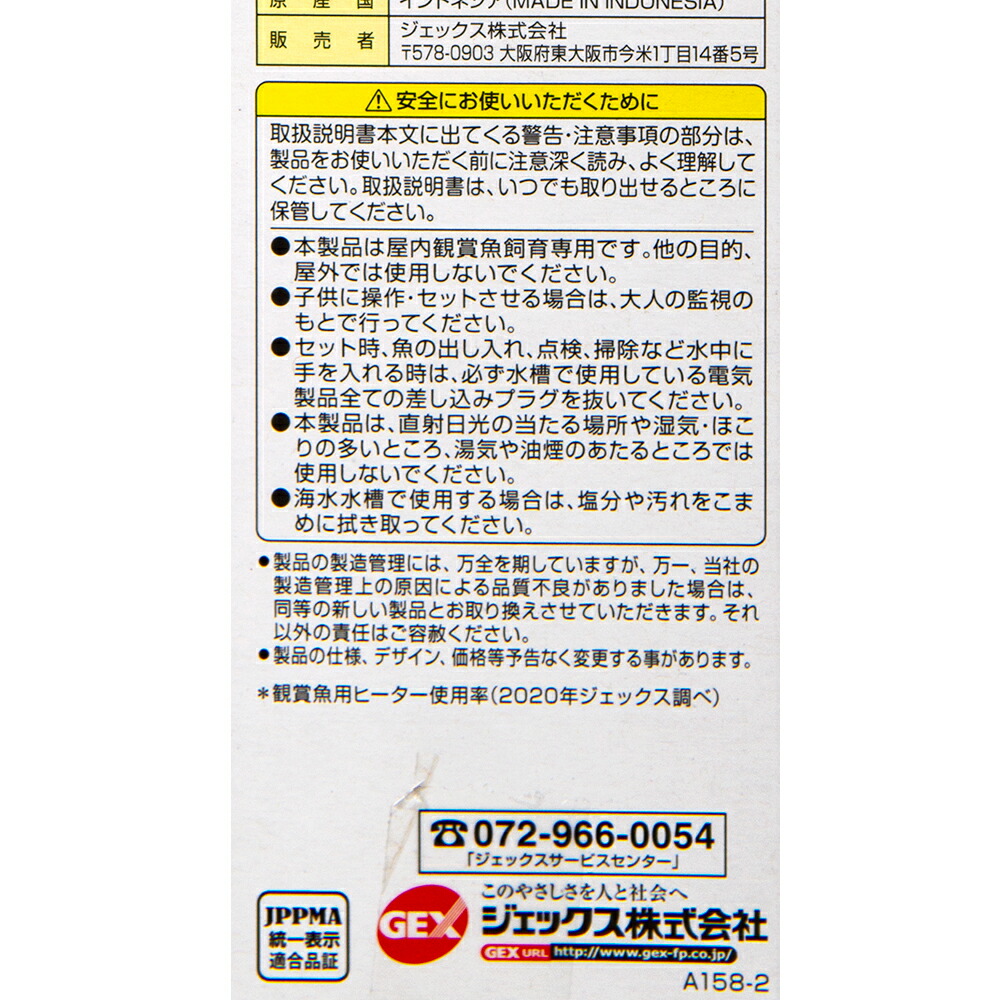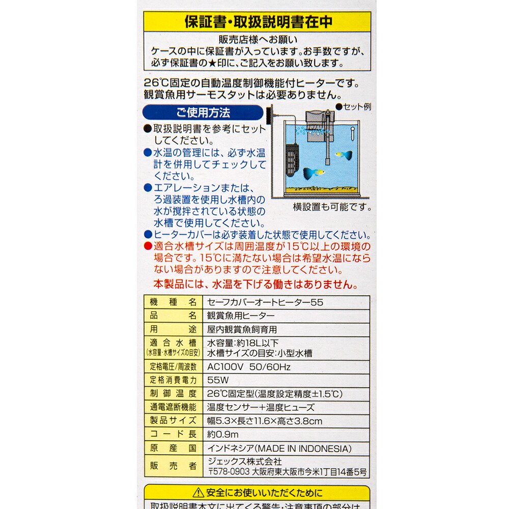 | ご注意 | ※本製品は室内観賞魚飼育専用です。他の目的には使用しないでください。 ※本製品には水温を下げる能力はありません。 ※子供には操作・セットさせないでください。操作させる時は大人の監視のもとで行ってください。 ※セット時、魚の出し入れ、点検、掃除など水中に手を入れる時は、必ず水槽で使用している電気製品すべての差し込みプラグを抜いてください。 ※本製品は、直射日光のあたるところや湿気・ほこりの多い所、油煙のあたる所では使用しないでください。 ※26℃固定の自動温度制御機能付きヒーターです。サーモスタットは必要ありません。 ※水温の管理には、必ず水温計を併用してチェックしてください。 ※エアレーションまたはろ過装置を使用し水槽内の水が撹拌されている状態の水槽で使用してください。 ※ヒーターカバーは必ず装着した状態で使用してください。 ※適応水容量は周囲温度が15℃以上の環境の場合です。 ※15℃に満たない場合は希望水温にならない場合がありますので注意してください。 ※安全にお使いいただくために、ヒーターの交換は1年が目安です。 ※ヒーター本体が完全に水中に浸かる位置にキスゴムで設置します。 |