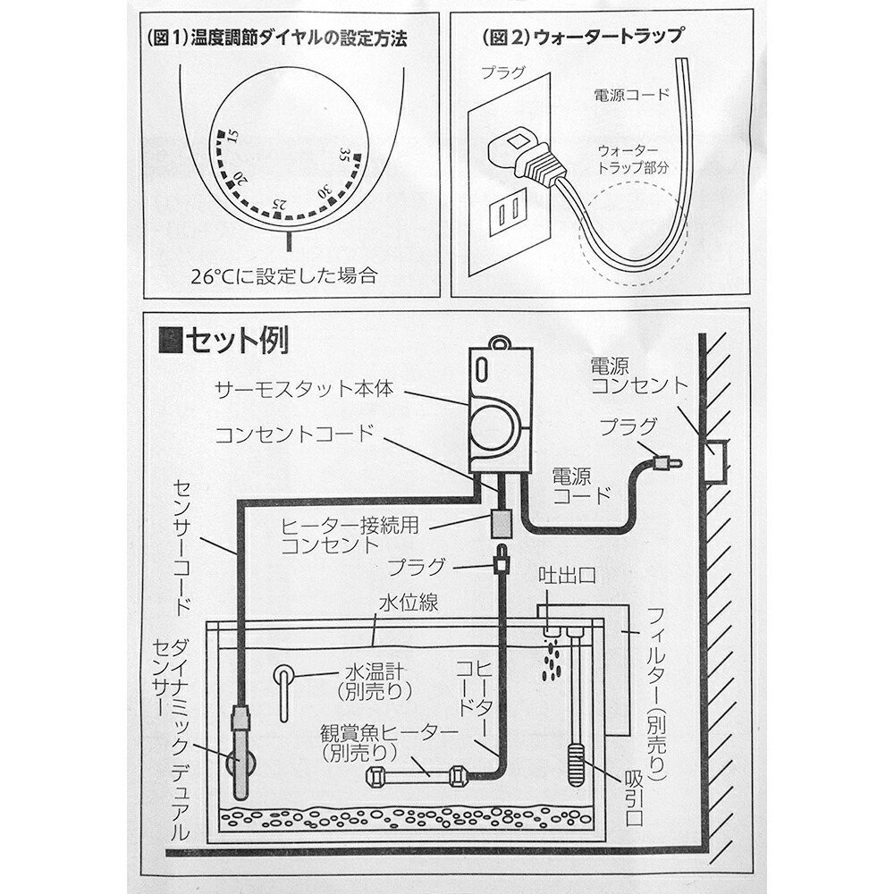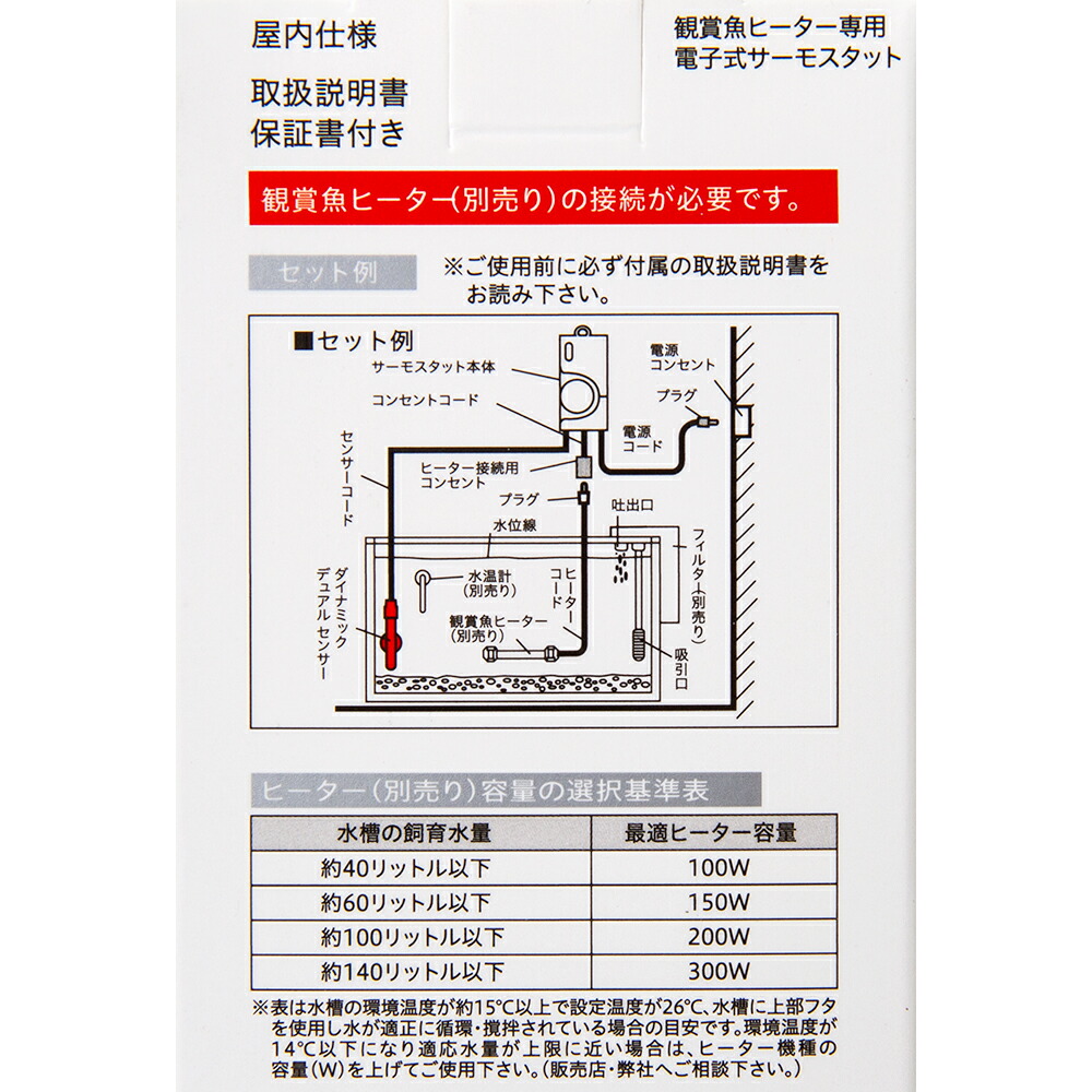 | ご注意 | ※本製品は、観賞魚ヒーターをコントロールするためのサーモスタットです。製品自体に保護機能はありませんので、観賞魚ヒーター(別売り)の接続が必要です。 ※観賞魚ヒーター専用に設計された器具ですので、それ以外の器具は絶対に接続しないでください。 ※水槽での観賞魚飼育を目的に設計された製品ですので、その他の目的には使用できません。 ※屋内専用に設計された製品ですので、屋外では使用できません。 |