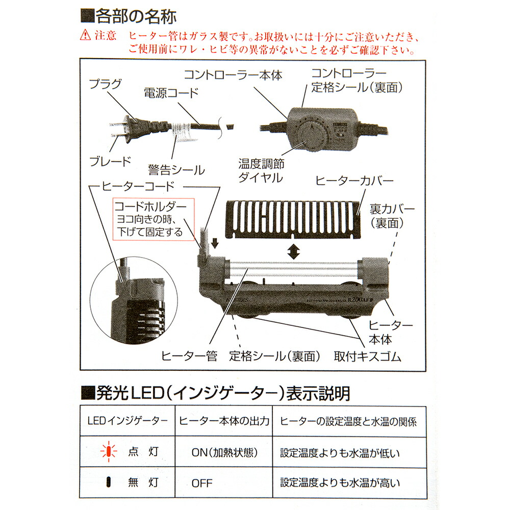 | ご注意 | ※本製品は温度コントローラー(サーモスタット)とヒーターが1体型の観賞魚用保温器具です。 ※ヒータ部本体はガラス製ですので、お取り扱いには十分にご注意いただき、ご使用になる前にワレ・ヒビなどの異常がないことを必ずご確認ください。また、付属の取扱説明書を必ずお読みになり正しくセットしてください。 ※屋内専用に設計された製品ですので屋外での使用はできません。 ※小型水槽・容器などの観賞魚飼育を目的に、水中専用として設計された製品ですので、それ以外の目的には使用できません。 ※水温を冷却する機能はありません。 |