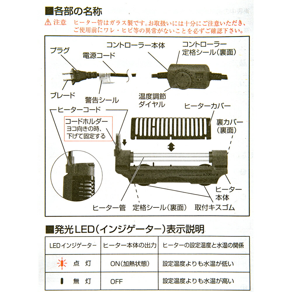 | ご注意 | ※本製品は温度コントローラー(サーモスタット)とヒーターが1体型の観賞魚用保温器具です。 ※屋内専用に設計された製品ですので屋外での使用はできません。 ※小型水槽・容器などの観賞魚飼育を目的に、水中専用として設計された製品ですので、それ以外の目的には使用できません。 ※水温を冷却する機能はありません。 |