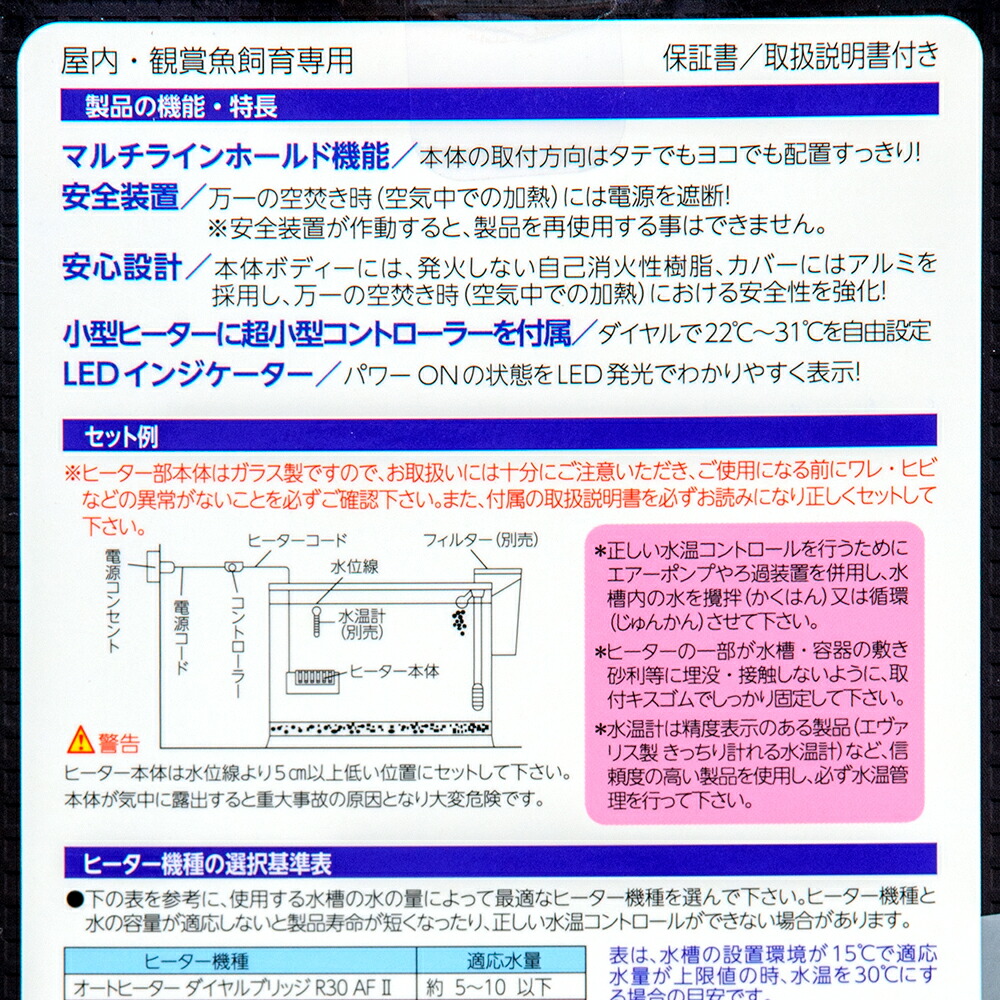 | 特長 | ●サーモスタットとヒーターの一体型の観賞魚用保温器具です。 ●本体の取付方向はタテでもヨコでも配置すっきりなマルチラインホールド機能です。 ●万一の空焚き時(空気中での加熱)には電源を遮断します。 ※安全装置が作動すると、製品を再使用する事はできません。 ●本体ボディーには、発火しない自己消化性樹脂、カバーにはアルミを採用し、万一の空焚き時(空気中での加熱)における安全性を強化しました。 ●小型ヒーターに超小型コントローラーを付属したため、ダイヤルで22℃~31℃を自由に設定できます。 ●パワーONの状態をLED発光でわかりやすく表示します。 |