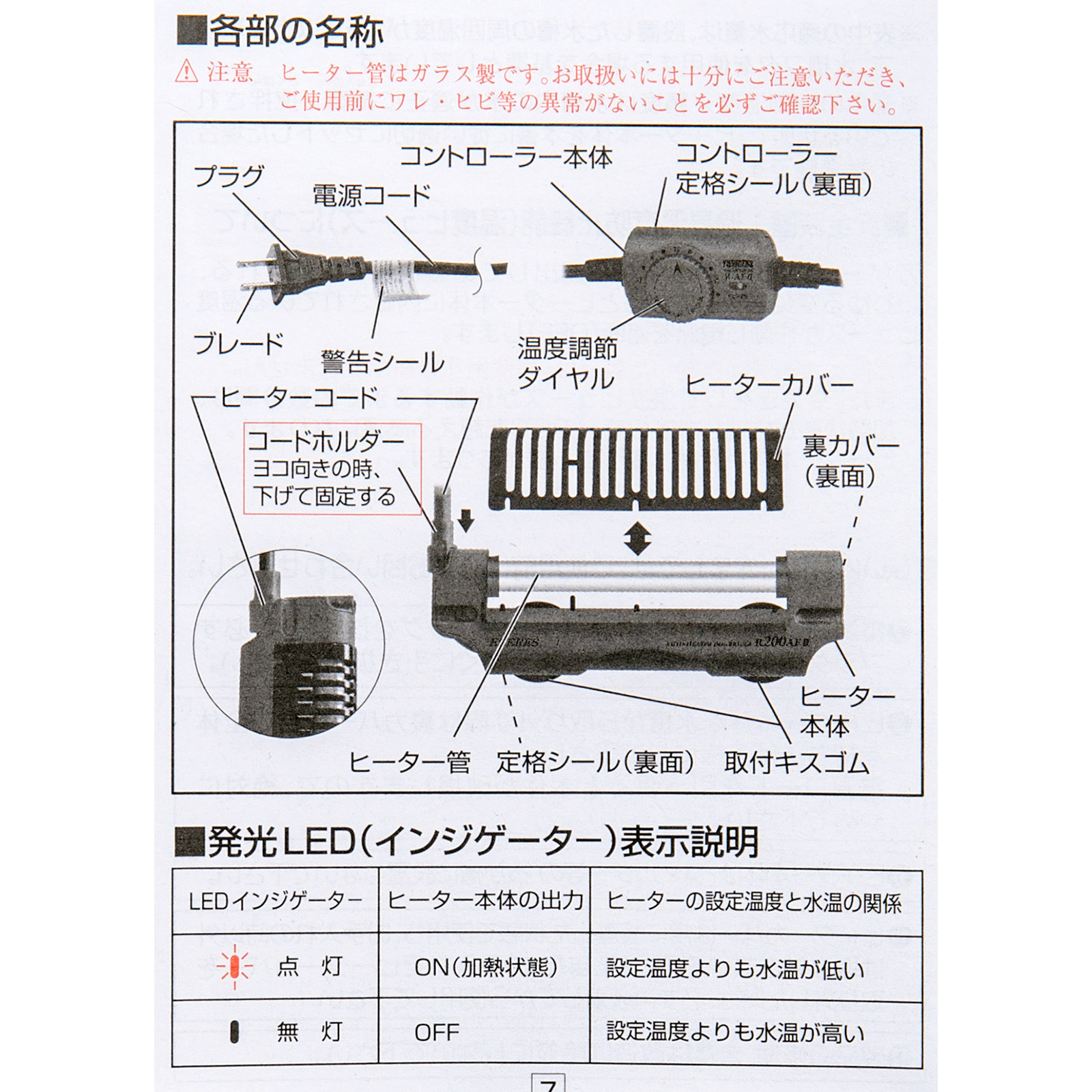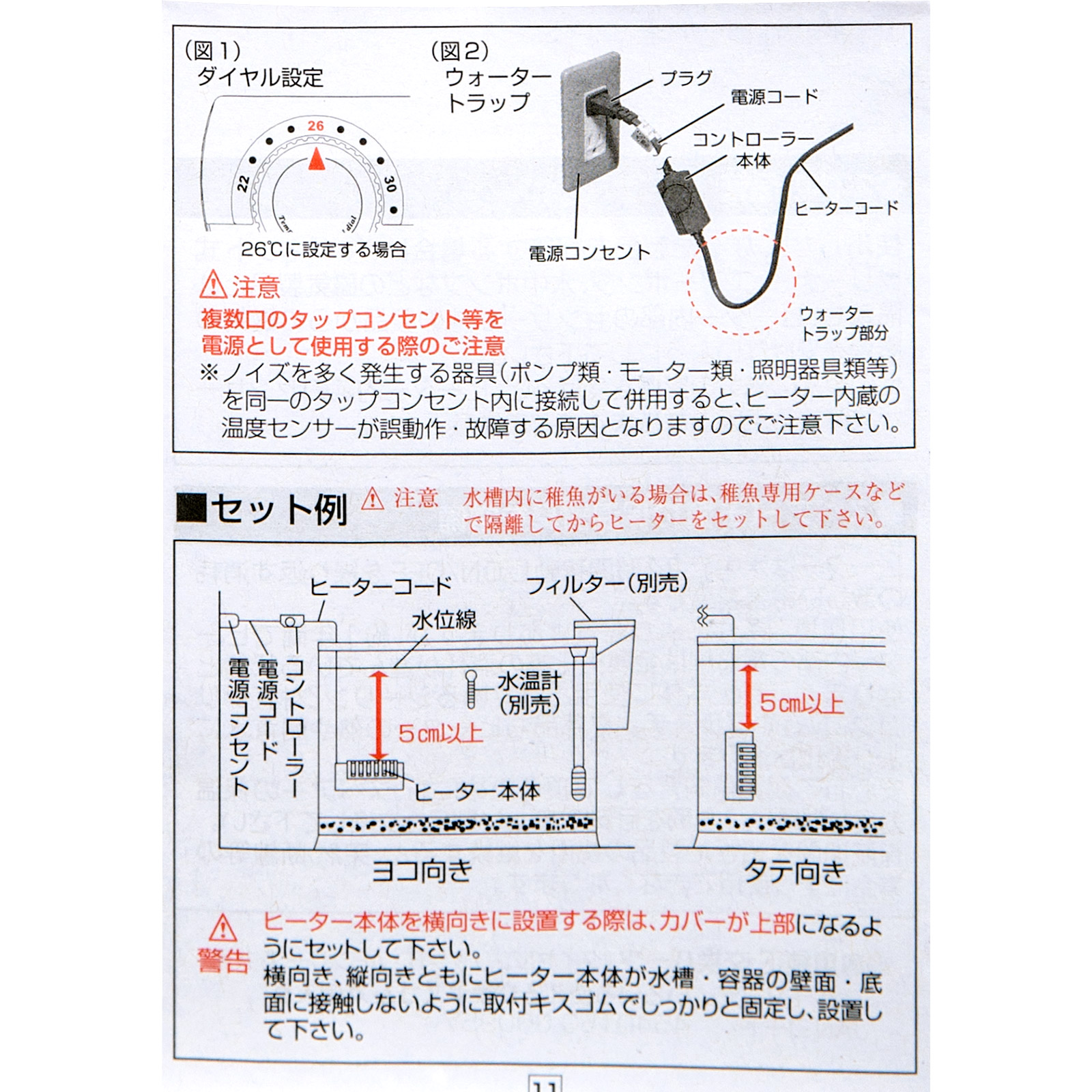 | ご注意 | ※本品は温度コントローラー(サーモスタット)とヒーターが1体型の観賞魚用保温器具です。 ※屋内専用に設計された製品ですので屋外での使用はできません。 ※小型水槽・容器などの観賞魚飼育を目的に、水中専用として設計された製品ですので、それ以外の目的には使用できません。 ※水温を冷却する機能はありません。 |