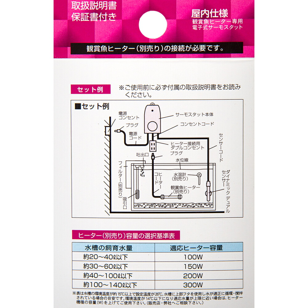 | ご注意 | ※本品は観賞魚ヒーター専用に設計された器具です。目的以外の用途では使用しないでください。 【エヴァリス EVサーモ600-WR3】 ※屋内水槽での観賞魚飼育を目的に設計された製品ですので、その他の目的には使用できません。 ※屋内専用に設計された器具ですので、屋外では使用できません。 ※本品は鑑賞魚用ヒーターをコントロールするためのサーモスタットです。本品自体に保温機能はありませんので、別売りの鑑賞魚用ヒーターの接続が必要です。 ※本品に接続可能なヒーターの合計容量は605Wまでです。 【エヴァリス サーマルプロテクト パワーヒーターHTP300×2】 ※ヒーター単体での使用は危険です。本体に温度制御機能はありません。サーモスタット(別売)の接続が必要です。 ※ヒーター本体を水中にセットする前に電源を入れると空焚き防止機能(温度ヒューズ)が作動し、製品が使用できなくなります。 ※屋内・観賞魚飼育専用に設計された製品です。その他の目的には使用できません。 | ||||||||||