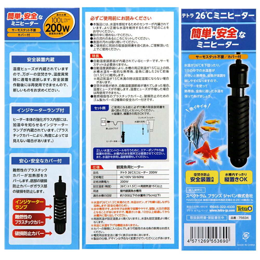 テトラ 26℃ミニヒーター 200W 安全カバー付 60cm水槽 100L以下 保温 サーモスタット+ヒーター一体型 安全機能付 アクアリウム 熱帯魚