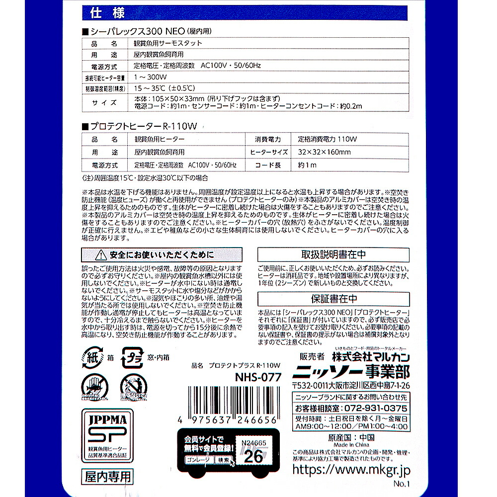 | セット内容 | ・ニッソー プロテクトプラス R-110W ヒーター+サーモスタット×1 《セット内容》 サーモスタット(シーパレックス300 NEO)×1 ヒーター(プロテクトヒーターR-110W)×1 ・ニッソー プロテクトヒーター R-110W サーモスタット接続用×1 |