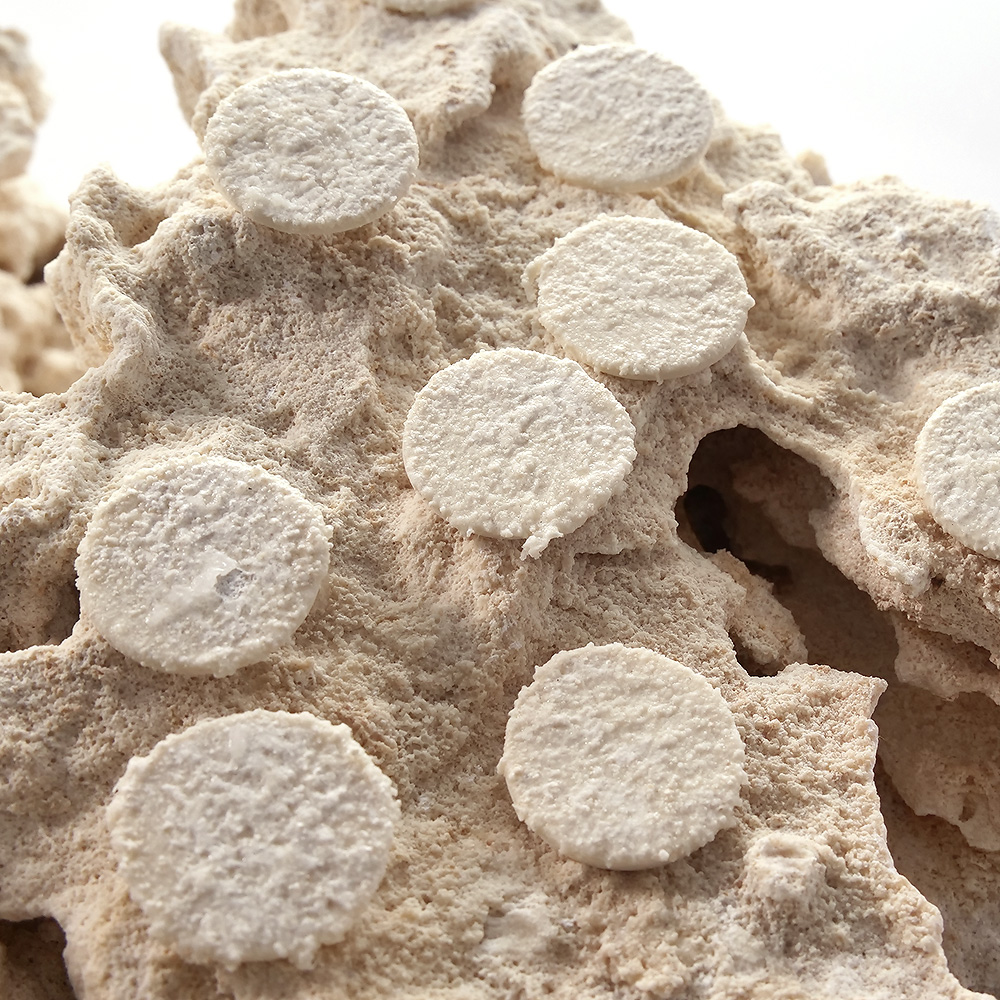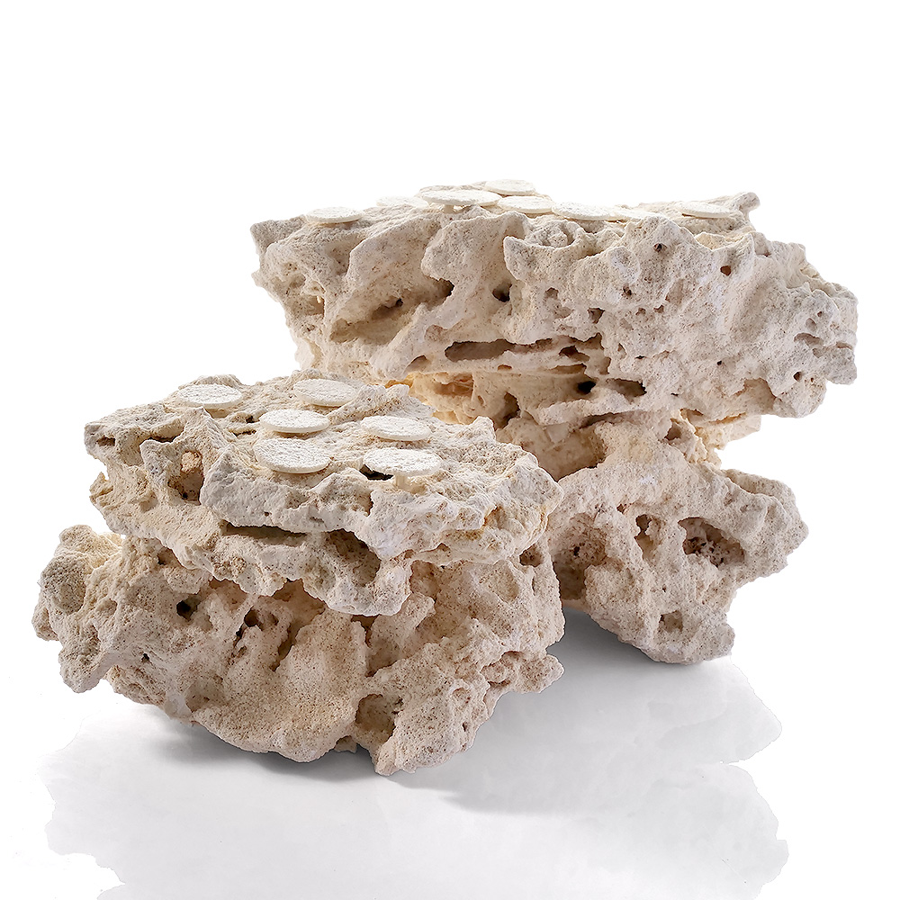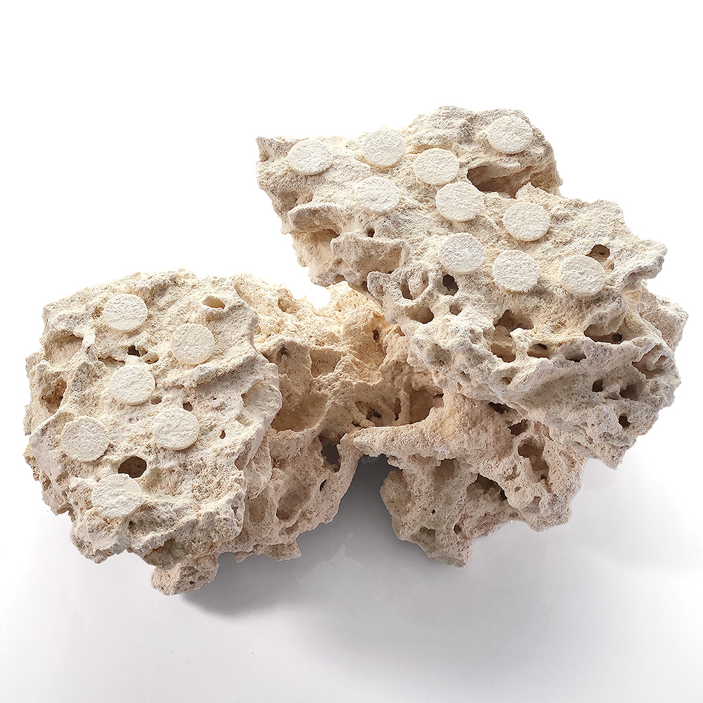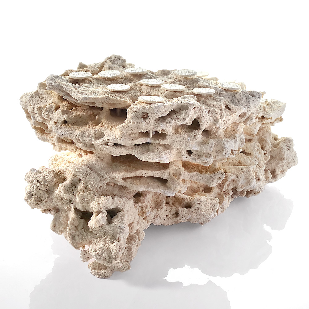 | 特長 | ◆マルコロックとは?◆ ●フロリダ半島の陸地で採掘された、クリーンで上質なアラゴナイト石灰岩です。 ●一般的な石灰岩と比べて空隙が多く、多孔質な構造を保っています。 ●従来のライブロックのようなウミケムシやシャコ、カニなど予期せぬ生物の持ち込みがありません。 【フラグベース】 ●マルコロックを素材として組み上げたフラグベースロックです。 ●石材用シアノアクリレート系接着剤を使用し、強固に接着されています。 ●専用のポリカーボネート製サンドコーティングプラグがセットされています。 ●ロック内にサンドコーティングプラグ固定用のシリコン注入済み。プラグの抜き差しが容易に行えます。 【サンドコーティングプラグ】 ●従来のプレート部の厚みによる不自然な段差を解消する超薄型フラットプレートを採用しました。 ●ライブロックやマルコロックの自然な穴を利用できるピンワークストッパー仕様です。 ●プラグ本体は割れたり折れたりしにくいポリカーボネイト製です。 ●プレート表面をマルコロックと同じパウダーサンドでコーティングしたことにより、サンゴの接着性とベースとの一体感を高めています。 |