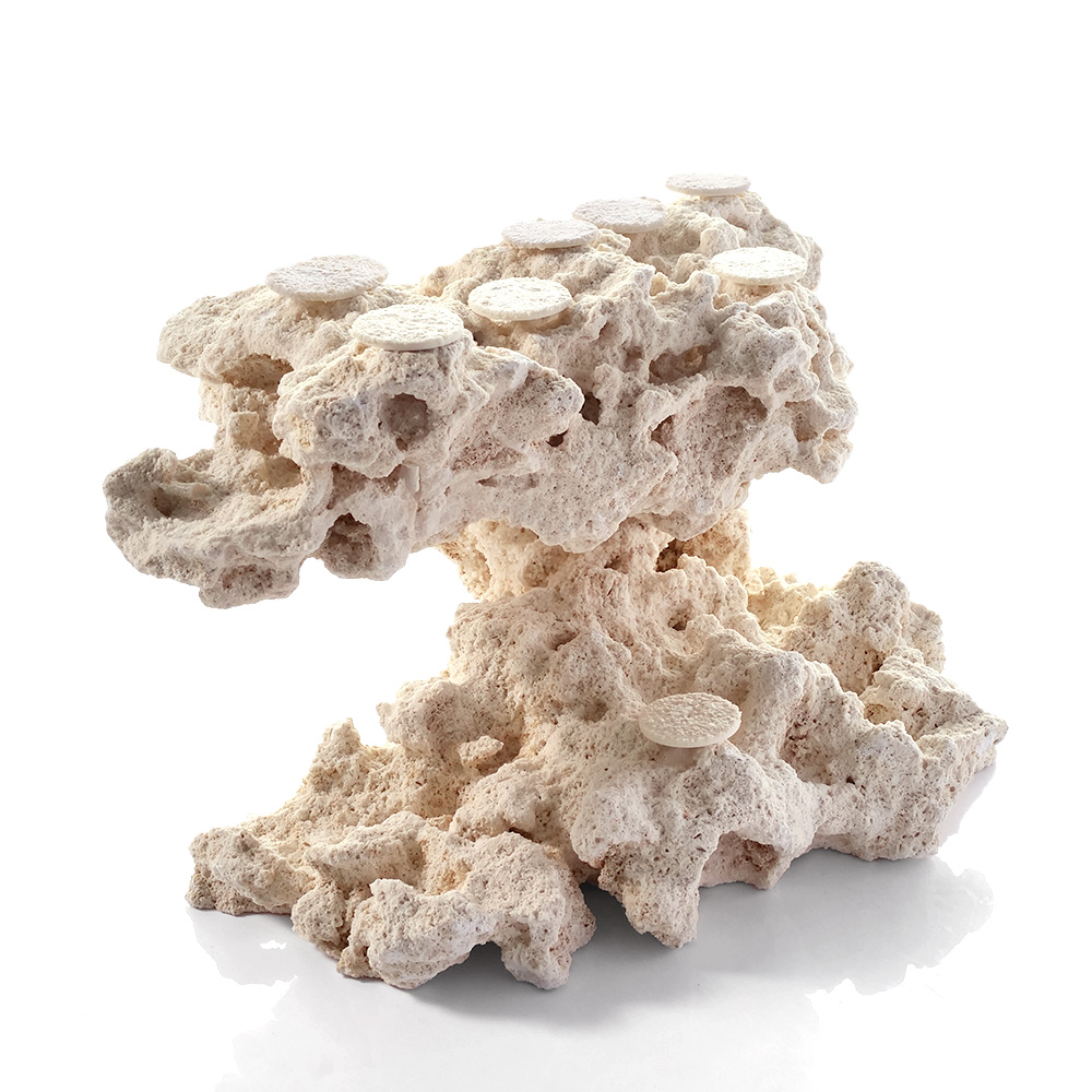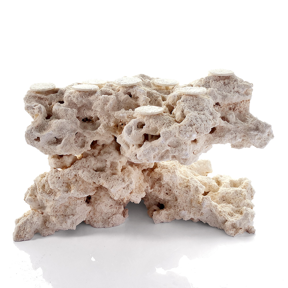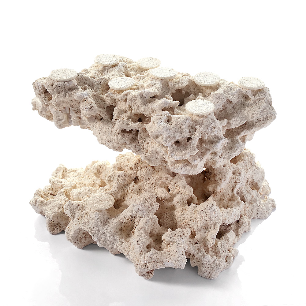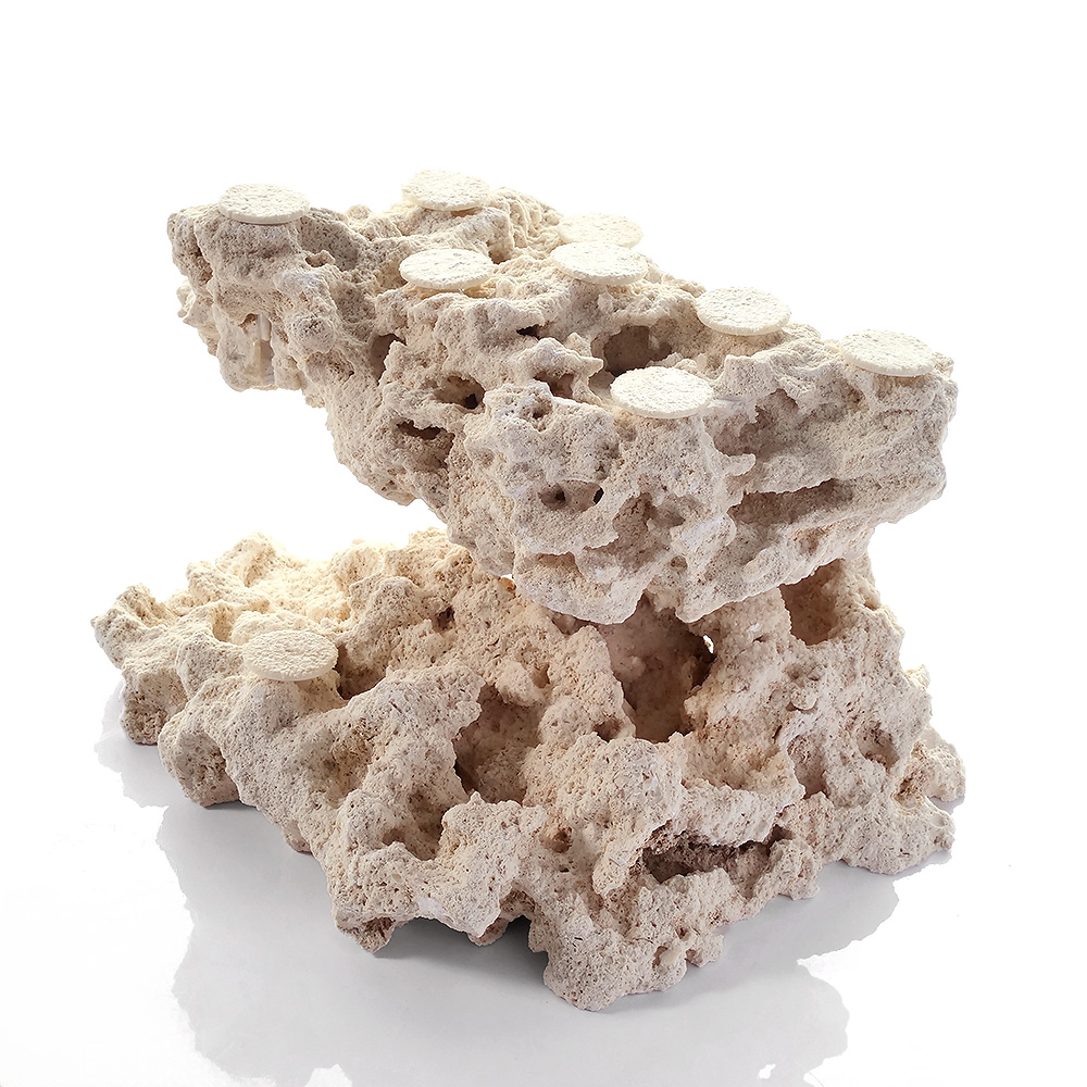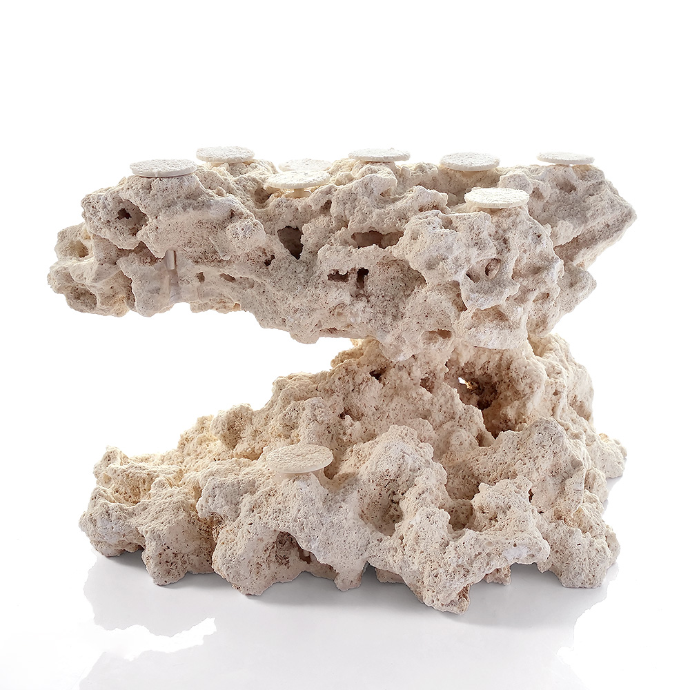 | 特長 | ◆マルコロックとは?◆ ●フロリダ半島の陸地で採掘された、クリーンで上質なアラゴナイト石灰岩です。 ●一般的な石灰岩と比べて空隙が多く、多孔質な構造を保っています。 ●従来のライブロックのようなウミケムシやシャコ、カニなど予期せぬ生物の持ち込みがありません。 【フラグベース】 ●マルコロックを素材として組み上げたフラグベースロックです。 ●石材用シアノアクリレート系接着剤を使用し、強固に接着されています。 ●専用のポリカーボネート製サンドコーティングプラグがセットされています。 ●ロック内にサンドコーティングプラグ固定用のシリコン注入済み。プラグの抜き差しが容易に行えます。 【サンドコーティングプラグ】 ●従来のプレート部の厚みによる不自然な段差を解消する超薄型フラットプレートを採用しました。 ●ライブロックやマルコロックの自然な穴を利用できるピンワークストッパー仕様です。 ●プラグ本体は割れたり折れたりしにくいポリカーボネイト製です。 ●プレート表面をマルコロックと同じパウダーサンドでコーティングしたことにより、サンゴの接着性とベースとの一体感を高めています。 |