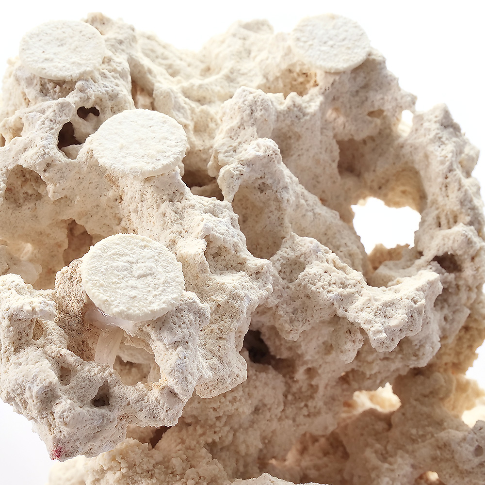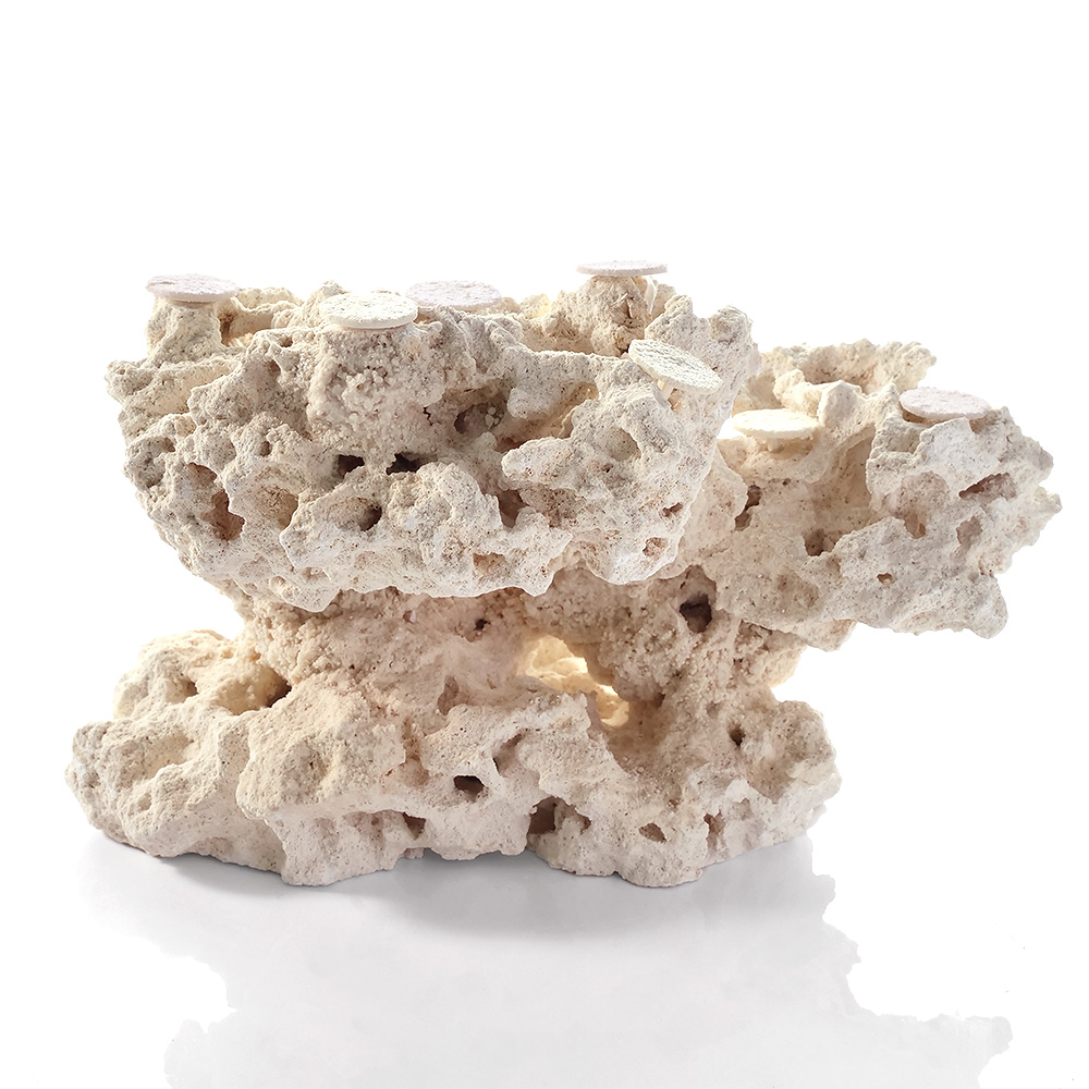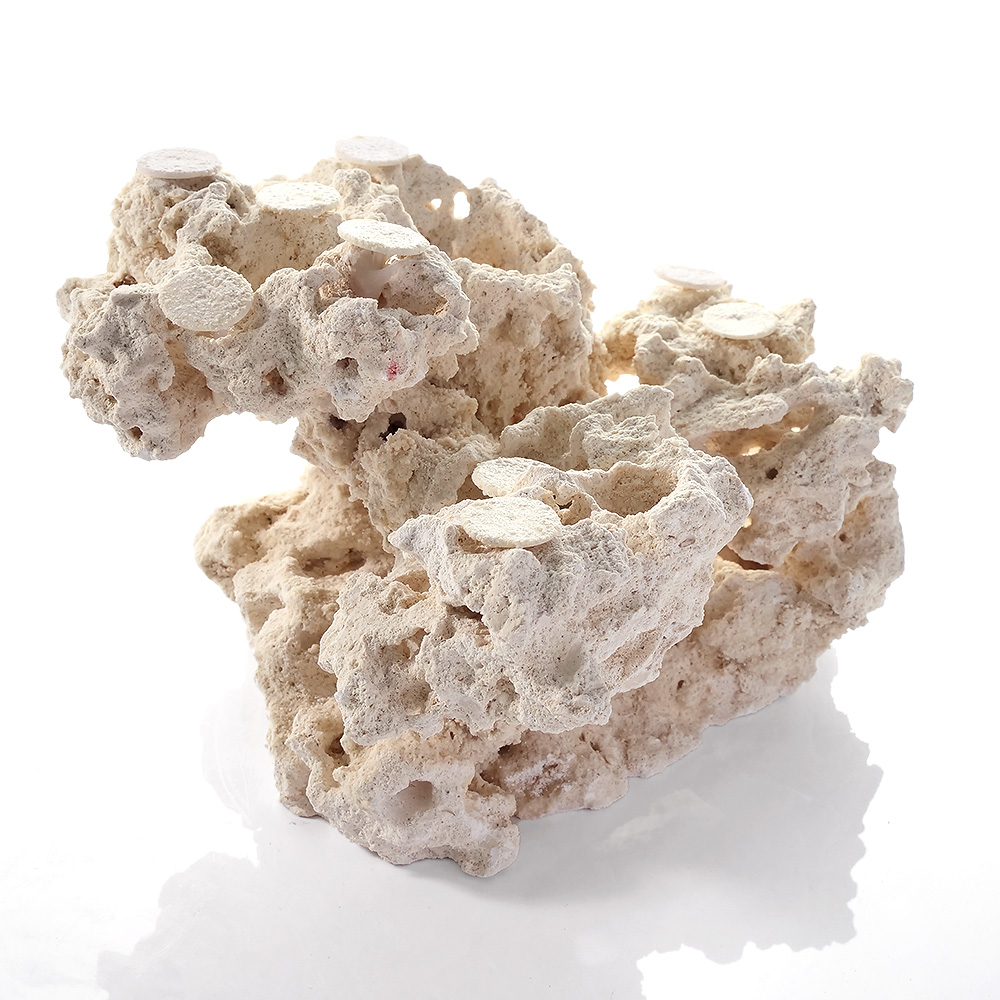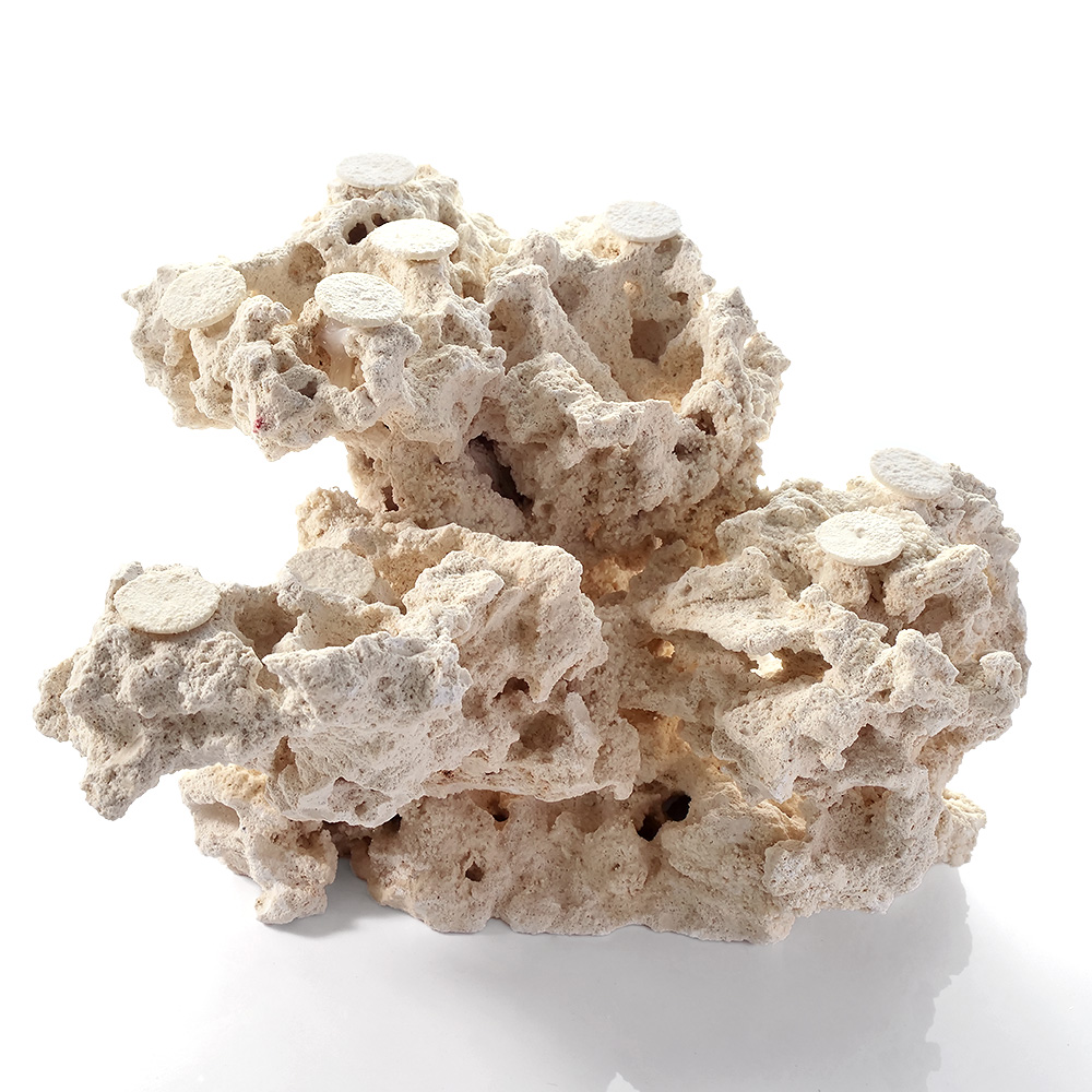 | 特長 | ◆マルコロックとは?◆ ●フロリダ半島の陸地で採掘された、クリーンで上質なアラゴナイト石灰岩です。 ●一般的な石灰岩と比べて空隙が多く、多孔質な構造を保っています。 ●従来のライブロックのようなウミケムシやシャコ、カニなど予期せぬ生物の持ち込みがありません。 【フラグベース】 ●マルコロックを素材として組み上げたフラグベースロックです。 ●石材用シアノアクリレート系接着剤を使用し、強固に接着されています。 ●専用のポリカーボネート製サンドコーティングプラグがセットされています。 ●ロック内にサンドコーティングプラグ固定用のシリコン注入済み。プラグの抜き差しが容易に行えます。 【サンドコーティングプラグ】 ●従来のプレート部の厚みによる不自然な段差を解消する超薄型フラットプレートを採用しました。 ●ライブロックやマルコロックの自然な穴を利用できるピンワークストッパー仕様です。 ●プラグ本体は割れたり折れたりしにくいポリカーボネイト製です。 ●プレート表面をマルコロックと同じパウダーサンドでコーティングしたことにより、サンゴの接着性とベースとの一体感を高めています。 |