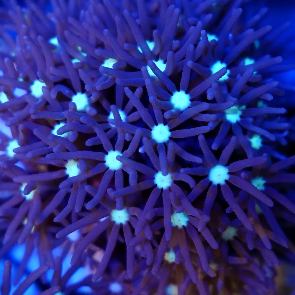 | 種類詳細 | ソフトコーラルの中でもポピュラーな種類で共肉が岩を覆いながら殖え、ポリプが開くと芝生のようになります。 バリエーションが様々あり共肉は紫や肌色、ポリプの中心部が星のように見えるようなものもあります。 非常に丈夫な種類で初心者にもお勧めですが導入後ポリプが開くまでは1ヶ月ほどかかる場合もあります。 状態が良いとどんどん殖えてきます。ハサミなどでカットして株分けすることも可能です。 |
