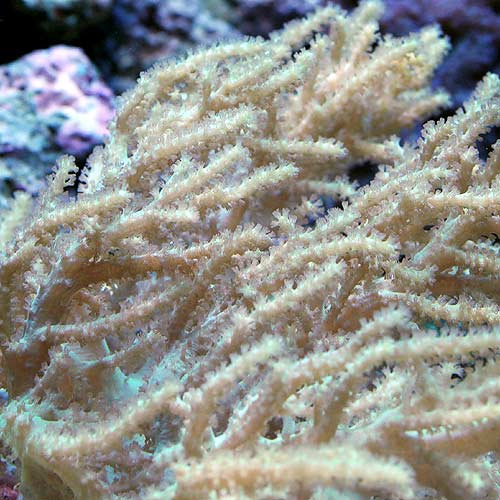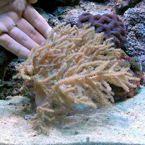 | 飼育のポイント | 丈夫なトサカ類であり、光及び水流が強めの環境を好みます。 光が弱すぎると茎が真っ直ぐ立たず、水流が弱るぎるとポリプを出さない場合が多いです。 また、低栄養塩の清浄な水質を好みますので、濾過のしっかりと効いた水槽での飼育が理想です。 |