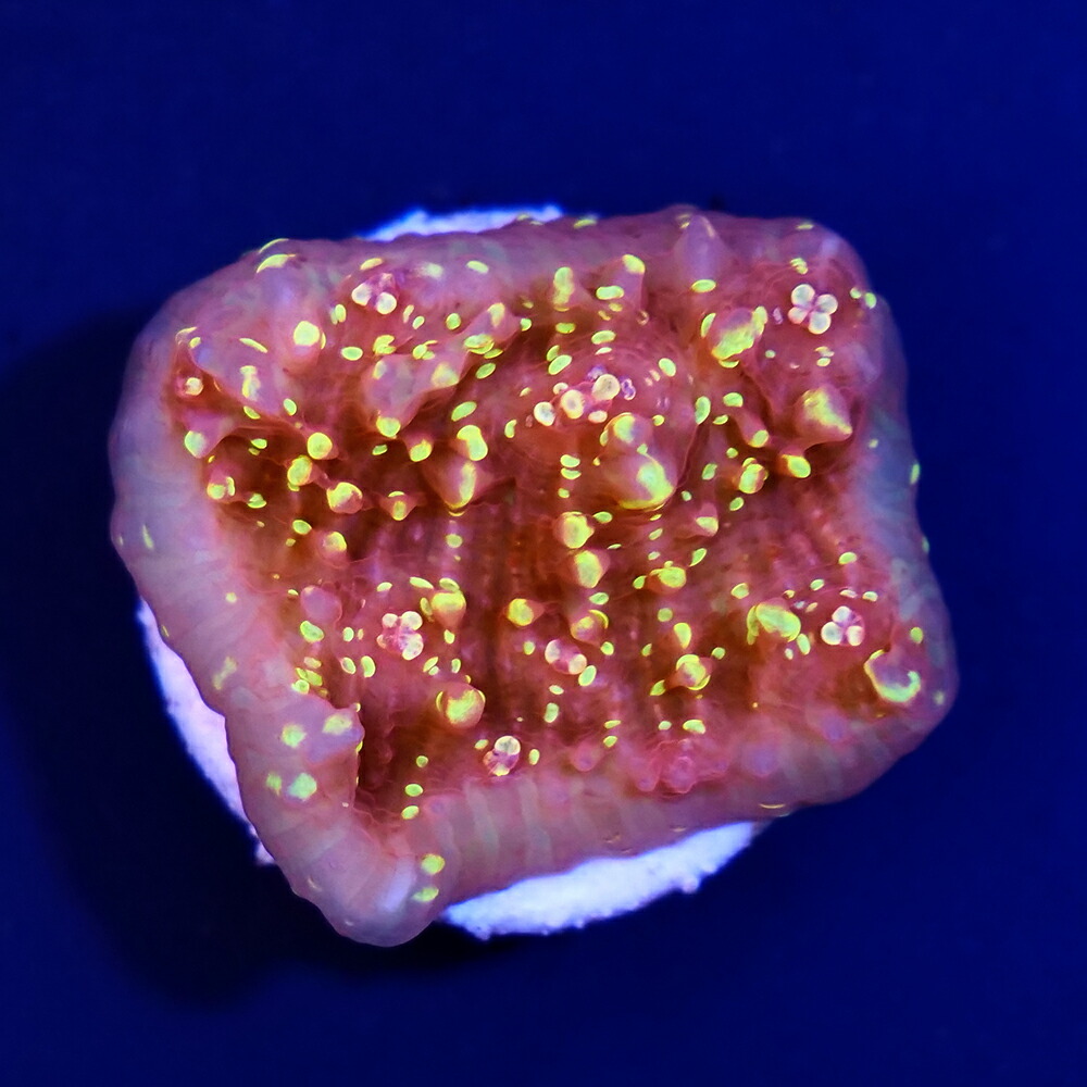 | 種類詳細 | 非常に丈夫で飼育しやすい為、ハードコーラル入門にピッタリなサンゴです。 色はブラウン、グリーン、レッド、ブルーなどの単色の物やブルーにレッドのドットなど様々なカラーがあります。 オレンジやグリーンの個体は蛍光色に輝くものも存在し、水槽内を幻想的に彩ります。 キッカサンゴの仲間は毒性が強いので他のサンゴに触れないようにご注意下さい。 給餌は基本的に液体飼料を与えます。クリル片等を週に1度程度与えるのも良いでしょう。 |