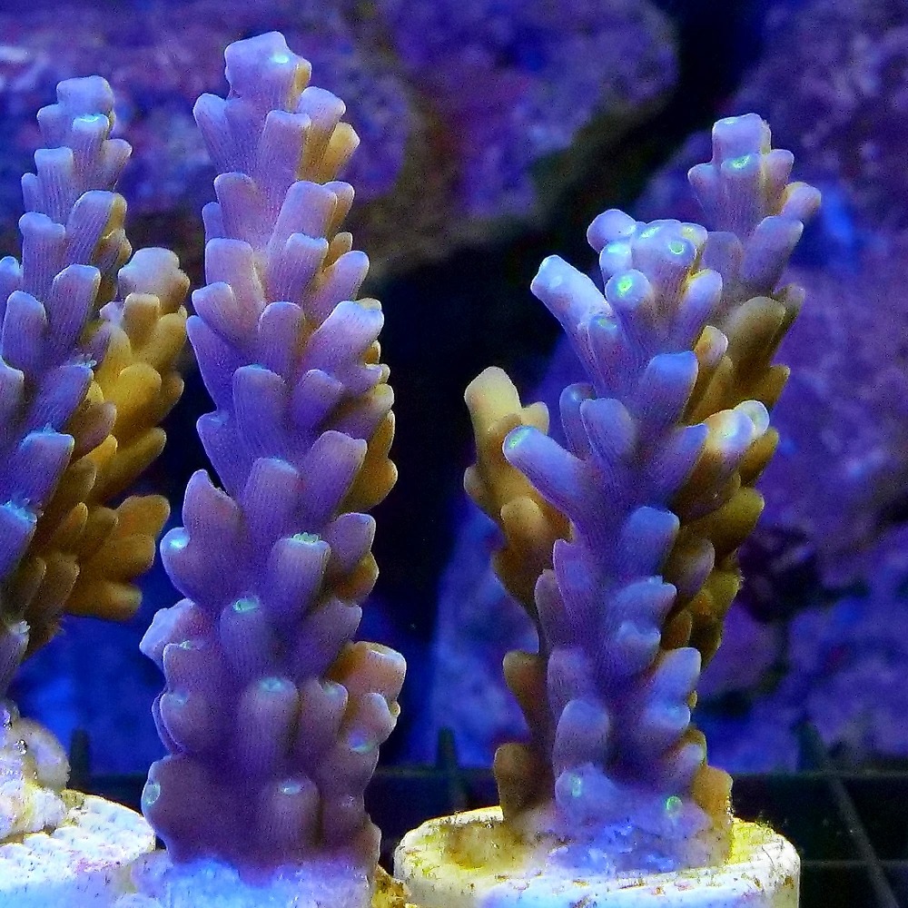 | 種類詳細 | 蛍光色がきれいなミドリイシです。 あらゆるサンゴの中でも飼育条件はかなり厳しく、強めの照明及びランダムな水流、カルシウムをはじめとした微量元素、 KH、pHの値にも敏感で、成長を妨げる栄養塩も低く抑える必要があります。 設備としてはできれば100リットル以上の水槽で、大出力のプロテインスキマーを用いたベルリンシステムで飼育するのが主流です。 他には150W以上のメタルハライドランプ、複数のポンプを用いてランダムな水流も起こしてあげましょう。 KHの値を安定させるにはカルシウムの添加が必要で、リアクターを用いるのが一般的ですが、ストロンチウムやマグネシウムがないとサンゴに吸収されにくいので、必要に応じて添加剤も併用すると良いでしょう。 硝酸塩、リン酸塩、ケイ酸塩などの栄養塩を抑えるにはRO浄水器を通した水を使ったり、吸着剤を利用します。 また、それらは魚からも排出されるため、エサをよく食べる生体との混泳には水替えを多くするなどの対応が必要です。 |