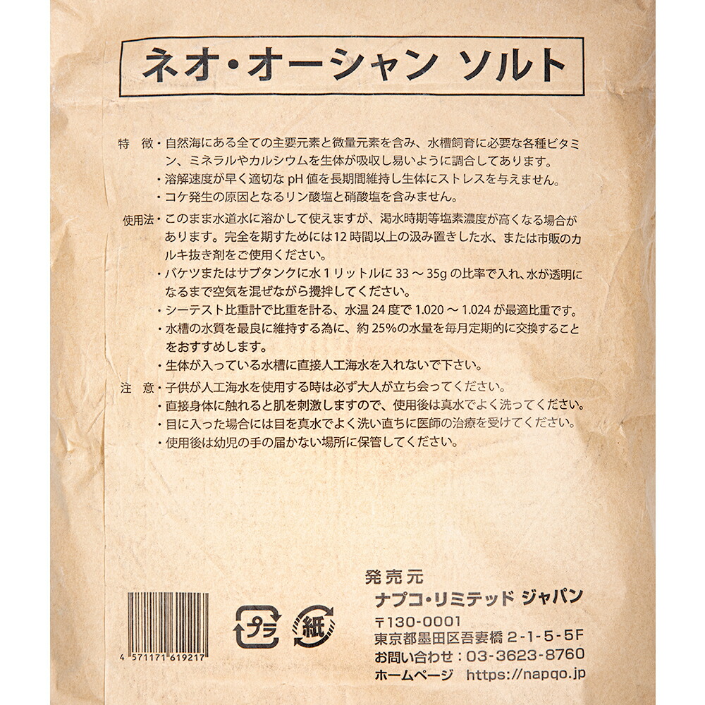 | 特長 | ●ナプコ本社社長:エドモンド・モウカ氏(元アクアリウムシステムズUSA社長)の監修により、日本で開発した人工海水です。 ●溶解速度を早め、カルシウムを強化しております。 ●自然海にある全ての主要元素と微量元素を含み、水槽飼育に必要な各種ビタミン、ミネラルやカルシウムを生体が吸収しやすいように調合してある人工海水です。 ●溶解速度が早く適切なpH値を長期間維持し生体にストレスを与えません。 ●コケ発生の原因となるリン酸塩と硝酸塩を含みません。 ●クラフト製外袋とアルミ製内袋により、外気との密封性を高めております。 |