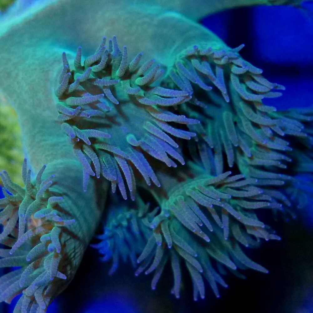 | 飼育のポイント | チョウチョウウオやヤッコなどポリプ食の魚との混泳は避けてください。 飼育条件はあまりうるさくありませんが1~2週間に一度サンゴ用フードを与えると良いでしょう。 また、水流が弱いとポリプの咲きにハリが無く、咲いても垂れてしまうことが多いです。 コモンサンゴ等と同様に水流及び光の当たり方によって骨格の形状に大きな差異が出ます。 |
