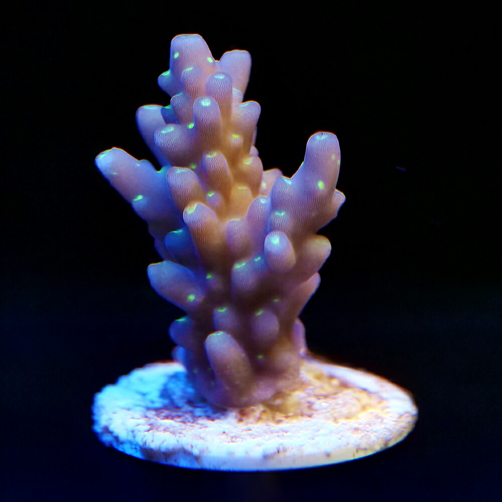 | 飼育のポイント | あらゆるサンゴの中でも飼育条件は厳しい種類で強めの照明及びランダムな水流を当てる必要があります。 また、カルシウムをはじめとした微量元素やKH・pHの値にも敏感で、成長を妨げる栄養塩も低く抑える必要があります。 硝酸塩、リン酸塩、ケイ酸塩などの栄養塩を抑えるにはRO浄水器を通した水を使ったり吸着剤を利用します。 栄養塩は魚からも排出されるためエサをよく食べる生体との混泳には水替えを多くするなどの対応が必要です。 飼育難易度自体は他のミドリイシと変わりませんが、照明が強すぎる、合わない等の場合は褐色化してくる事があります。 |