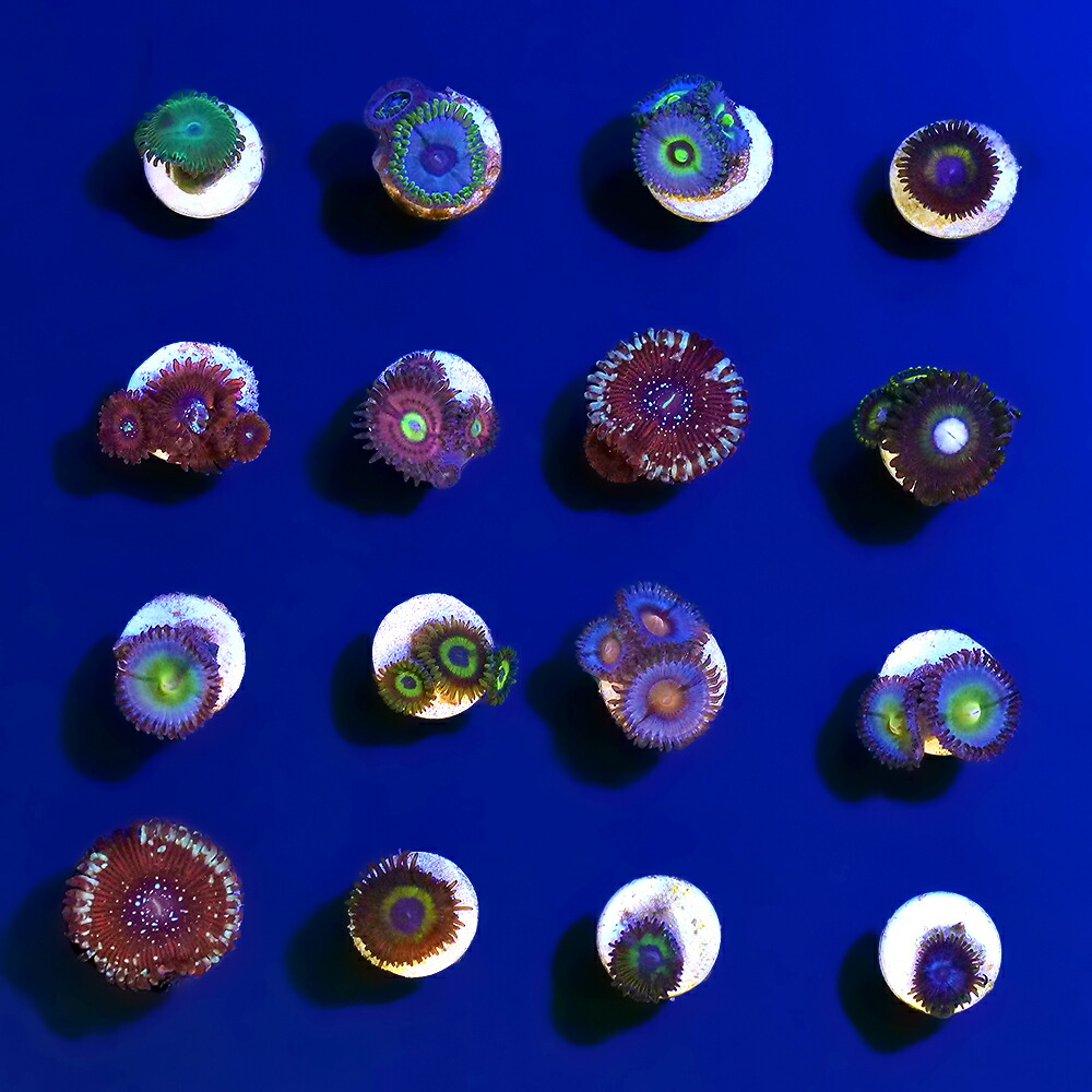 | 種類詳細 | イソギンチャクに近い種類のソフトコーラルで4~8mmのポリプが浅い海の岩の上にマット状の共肉でつながった大きな群体をつくります。 カラーバリエーションが豊富でグリーン、オレンジ、ピンク、レッドなどがありポリプの中心部に色が付いているものもあります。 丈夫ですのでサンゴ入門におすすめの種類で光・水流・水質ともに最低限の設備で飼育可能ですが環境を整えてあげると色はよく揚がり増殖するスピードも早くなります。 給餌は基本的に不要ですが与える場合は液体もしくは粉末状のものを週に1度程度吹きかけてあげると良いでしょう。 |